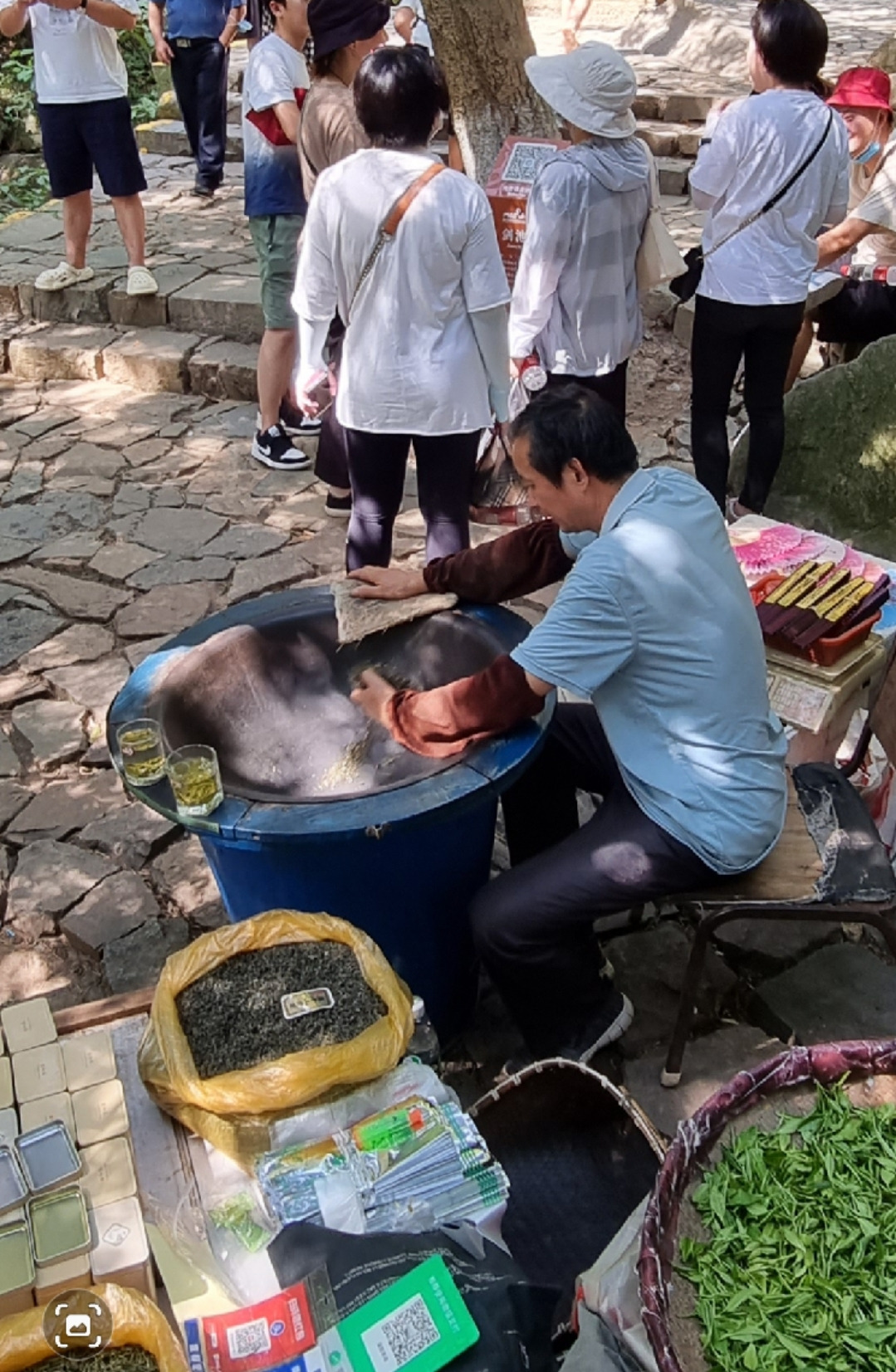 화팅 정류장에서 계곡 옆으로 난 반듯한 돌계단을 따라 대나무 숲 길을 400여 미터 내려갔다. 검지(剑池)에 못 미쳐서 칼을 좋아했다는 오왕 합려(闔閭, BC 515-496)를 위해 보검을 만들었다는 간장(干桨)과 모사(莫邪) 부부 동상이 보인다. 넓고 평탄하게 돌 블록을 깐 간장 부부 동상 부근에는 남녀노소 피서객들이 몰려 있고, 그 가장자리 한편에서는 중년 남성 한 분이 가마솥을 걸고 이 지역 특산 황야차(黄芽茶)를 덖고 있다.