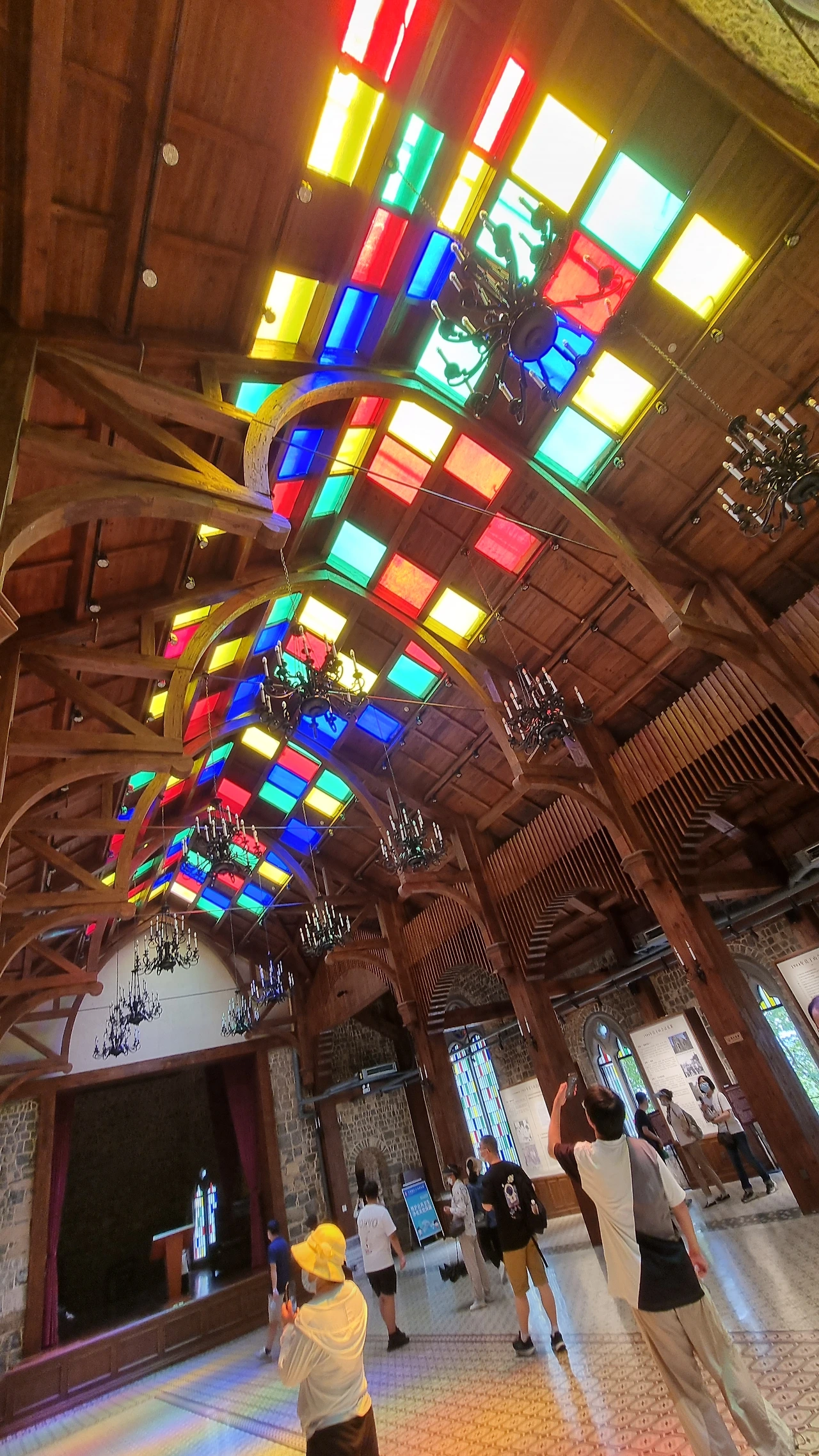 옛 교회당 건물 입구로 들어서니 전면 설교단 쪽으로 비스듬히 경사가 진 내부는 텅 비어있다. 천정을 따라 길게 배열된 빨강 초록 노랑 파랑 네 가지 색 사각형 색유리창들이 단순해 보이면서도 그 자체로 하나의 아름다운 예술 작품이다. 입구 쪽 벽면과 벽면 창 역시 교회나 성당에서 흔히 볼 수 있는 성화 스테인드글라스가 아니라 투명한 유리와 원색 유리의 사각 모자이크 유리창이다. 잠시 뒤쪽 벽면 벤치에 앉아 있으니 절로 마음이 차분해지고 경건해지는 느낌이다.