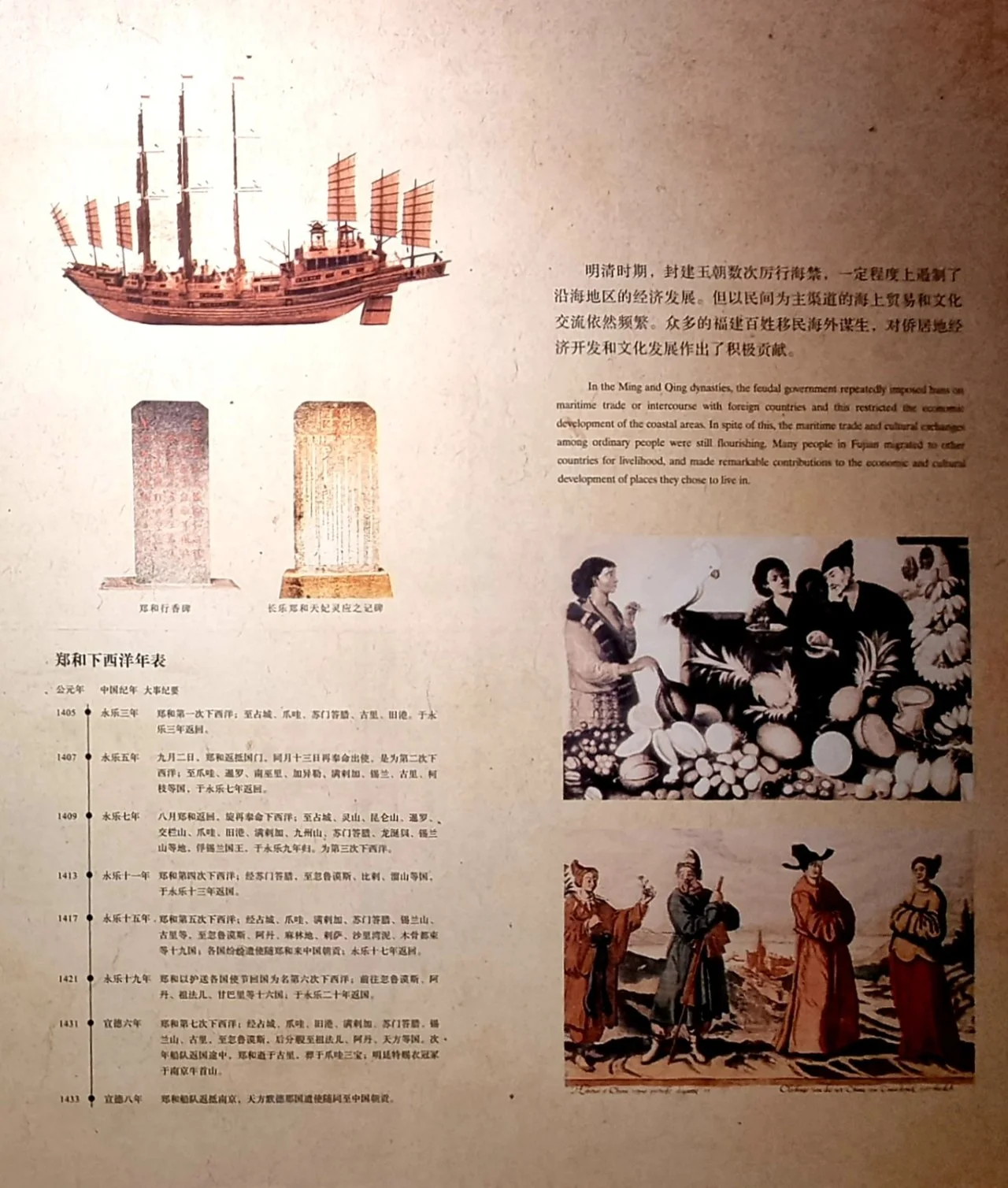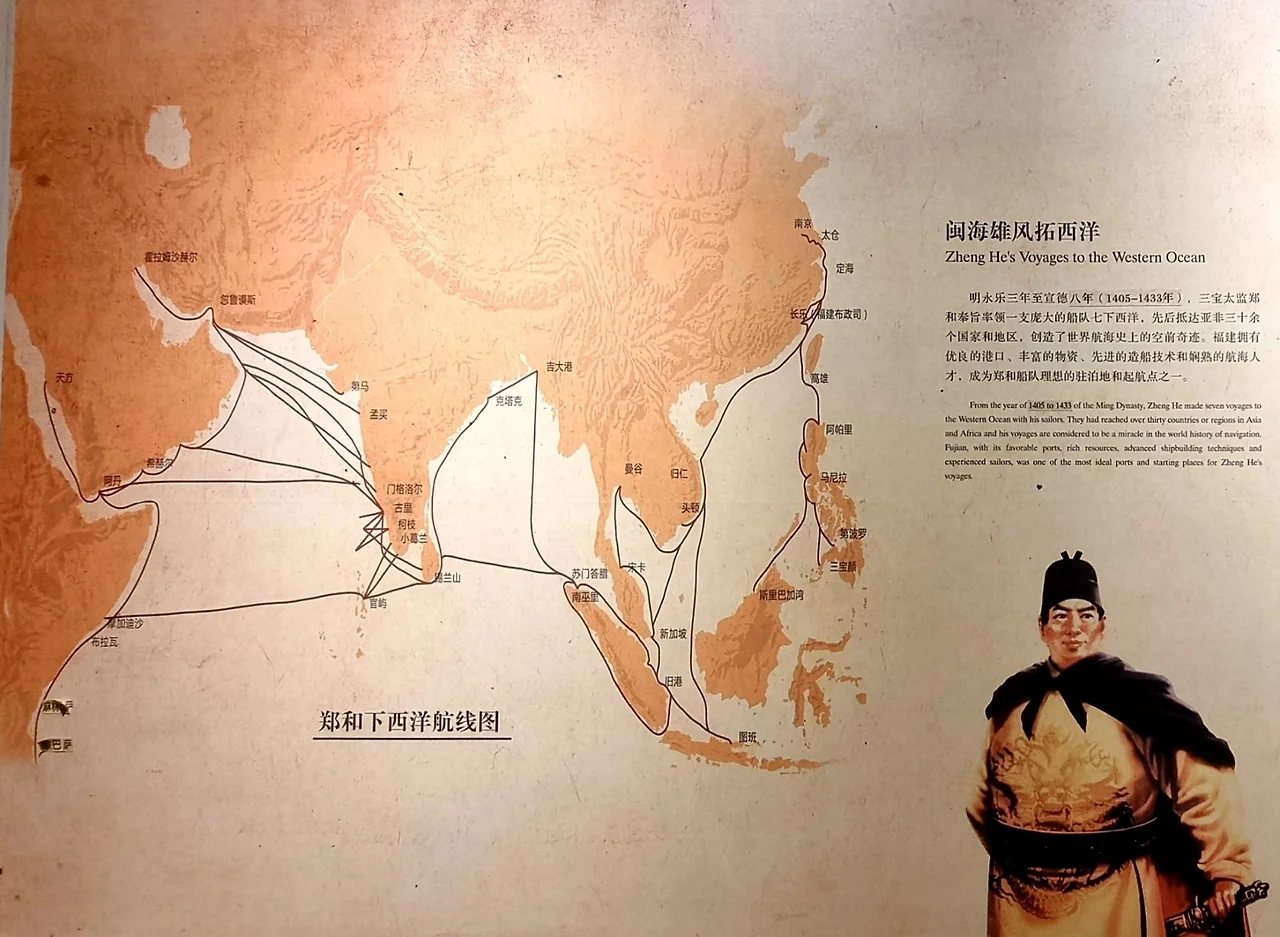 중국 대항해 시대를 열었던 정화(鄭和, 1371-1433)의 활약상에 대한 설명이 눈길을 끈다. 우수한 항구와 조선기술, 숙련된 항해 인력, 풍부한 물자 등의 조건을 갖춘 푸젠 지역은 정화 선단의 정박지이자 항해 출발지였다고 한다. 그는 지금의 윈난성 쿤밍 태생의 명나라 초기 항해가로 영락제(1360~1424)의 명으로 1405년부터 1433년 사이에 7차례에 걸쳐 동아시아의 말라카, 태국, 인도, 스리랑카, 페르시아의 호르무즈, 아라비아의 아덴, 소말리아의 모가디슈, 케냐의 뭄바이 등으로 항해를 했다고 한다.
