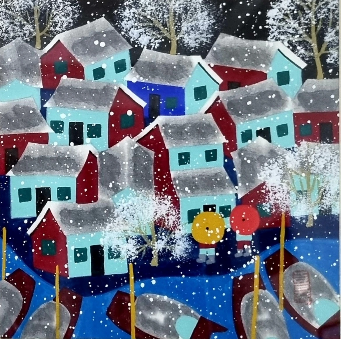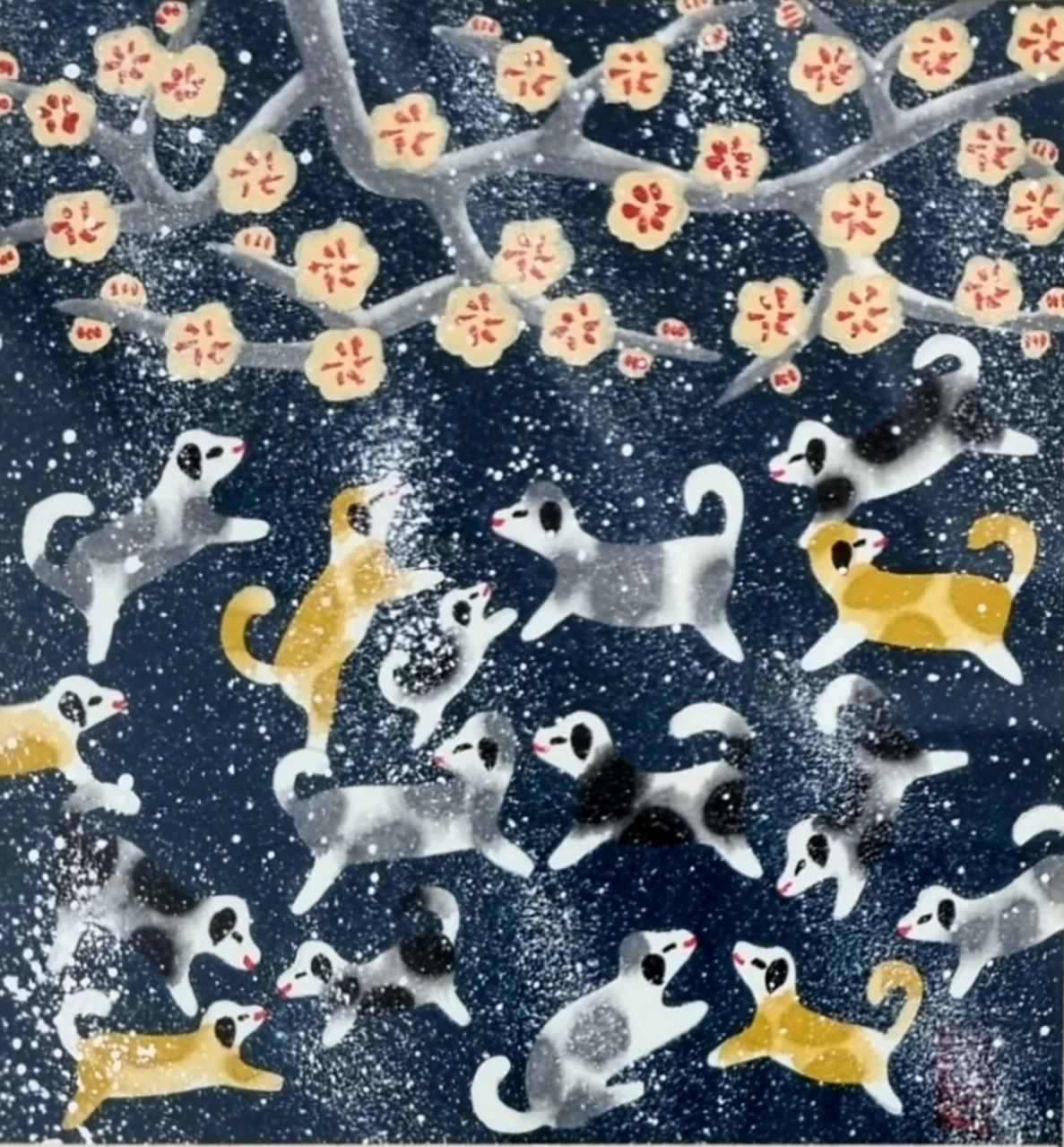 구입한 두 그림에는 제목이 붙어 있지 않았는데, 늦겨울에 가장 먼저 꽃을 피워 다가올 봄을 알린다는 라메이(腊梅) 아래서 신명 나게 뛰어노는 강아지들 그림에는 <매화꽃 아래 밤놀이(腊梅下夜戏)>, 화가가 태어나고 자란 이곳 마을의 옛 모습을 그렸다는 그림에는 <꿈속의 진샨(梦里金山)>이라는 제목을 붙여 보았다.