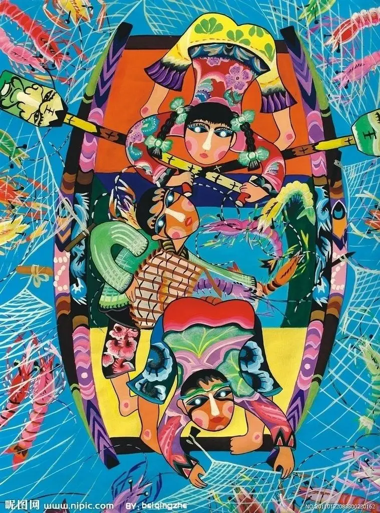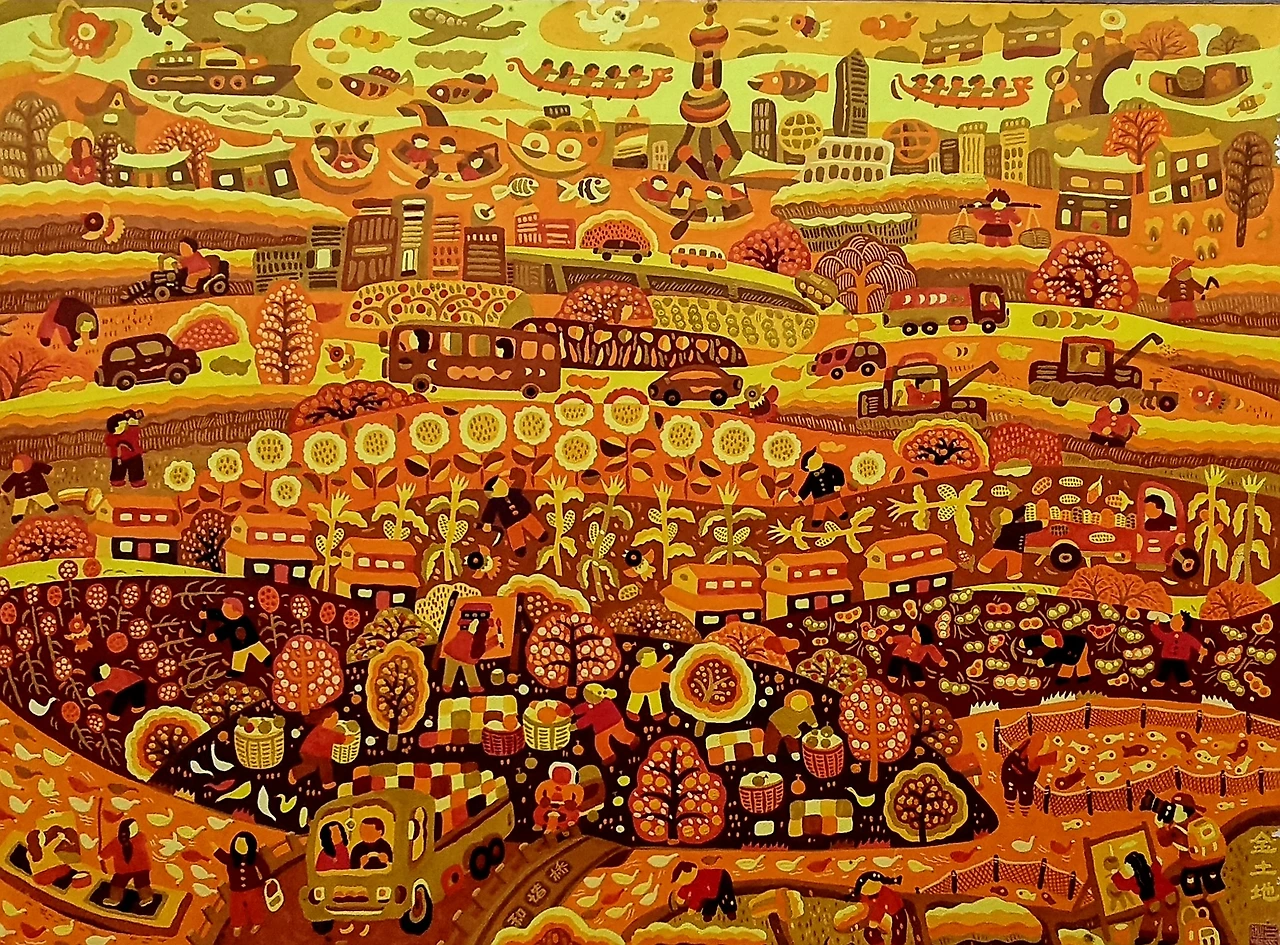 주황과 황금색이 넘치는 <황금의 땅(金土地)>과 <헤엄치는 거북(乌龟戏水)>은 가을 추수 때의 농촌 마을의 풍요로움과 장수를 기원하는 그림이라는 것을 쉽게 알 수 있다.