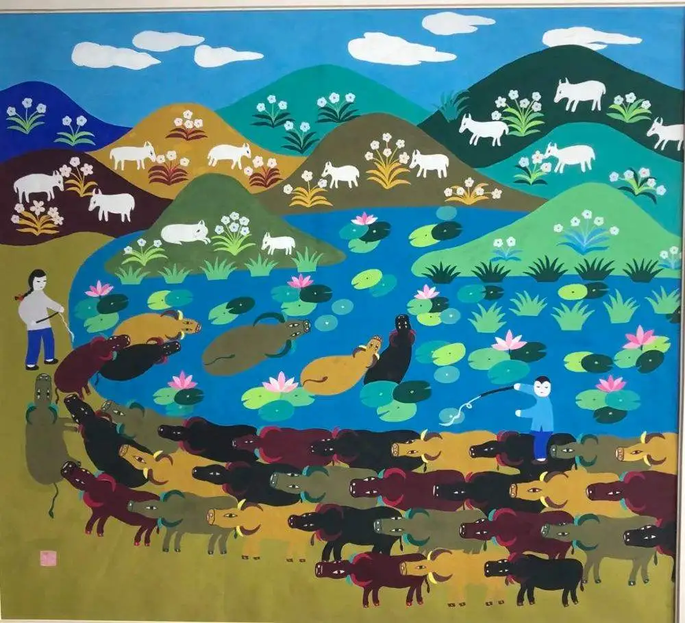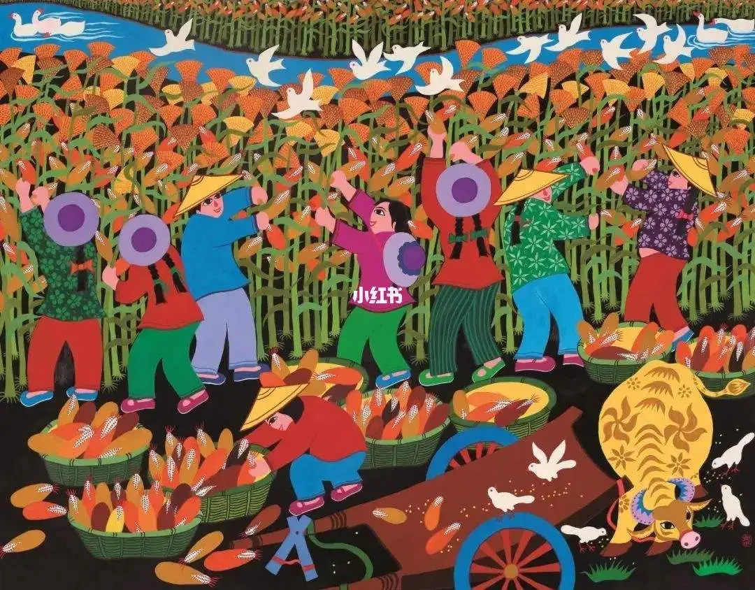 우리의 소위 '이발소 그림'을 연상케 하는 <양돈농가(养猪专业户)> 제목의 그림은 새끼들이 어미젖을 빠는 돼지우리 주변에 사람, 오리, 개, 닭 등이 어우러진 농가의 일상을 담았고, <두향(豆乡)>은 콩밭과 사람들의 모습을 노랑, 검정, 주홍 등 대조적 색채로 상징적으로 표현했다.