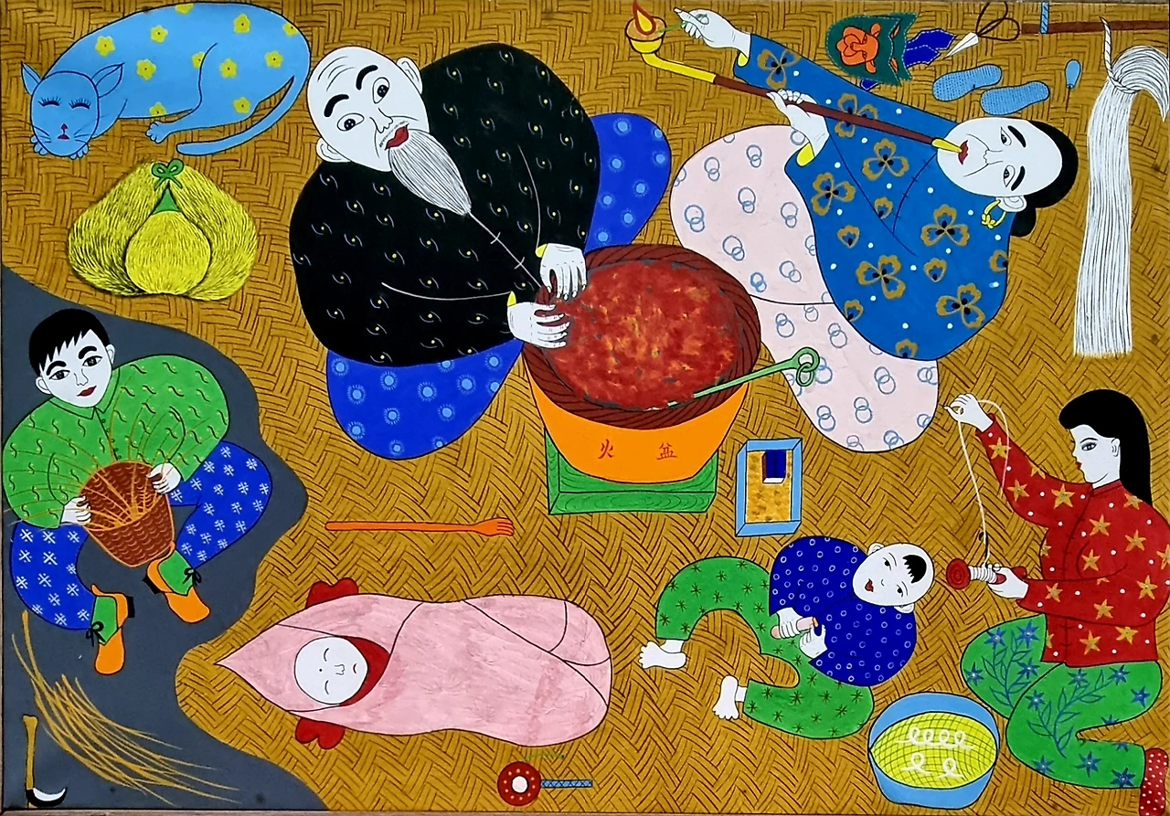 <관동의 혹한(关东三九)>은 화로에 손을 쬐는 할아버지와 곰방대에 불을 붙이는 할머니, 강보에 싸인 채 잠든 갓난아이와 그 옆 사내아이, 실을 감고 바구니를 엮는 젊은 부부, 웅크린 채 눈을 감은 고양이 등 한겨울 농가 방 안의 모습을 조감도처럼 위에서 내려다보는 각도로 담아냈다.