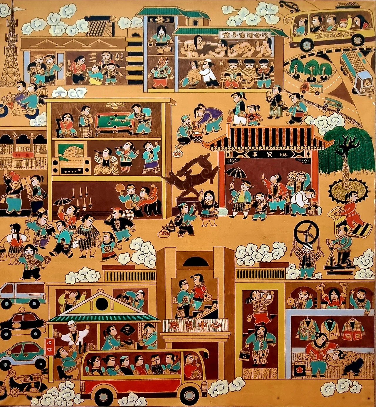 그 오른쪽으로 벽면 전체를 채운 산 언저리 눈 덮인 들녘에 두루미 떼가 노니는 그림을 배경으로 지린 동펑( 吉林 东丰) 지역 농민화들이 전시되어 있다. 그중 <뉴타운 구경(逛新城)>이라는 작품은 목욕하는 여인들, 가득 찬 승객을 싣고 달리는 버스, 당구와 볼링을 하는 사람, 거리를 거니는 사람들, 찻집, 길거리 가게, 양장점 등 도회지 풍경을 가로 세로 약 60 × 60cm 화폭에 빼곡히 담아냈다.