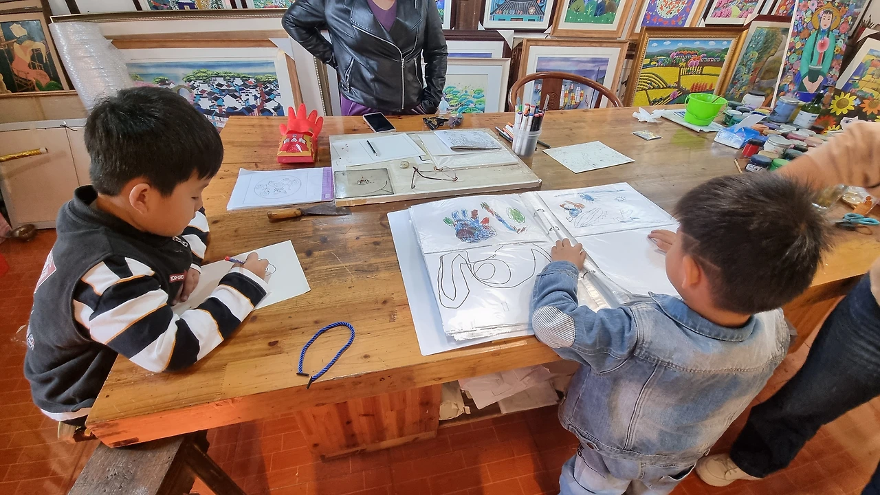 단청인가 5호로 들어서니 대여섯 살쯤으로 보이는 남자아이 두 명이 좁은 화실 안을 뛰어다니며 장난을 치고 있다. 화실 뒤 좁은 부엌에서 점심 준비를 하던 젊은 아낙이 아이들을 타일러 탁자 앞에 앉히자 자신들이 그린 두툼한 연습용 스케치북을 들추며 연필을 집어 든다. 농민화가 어떻게 대를 이어 가업처럼 전수되어 왔는지 짐작할 수 있는 장면이다.