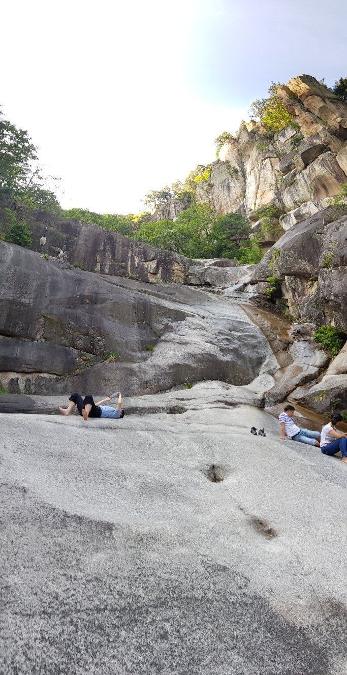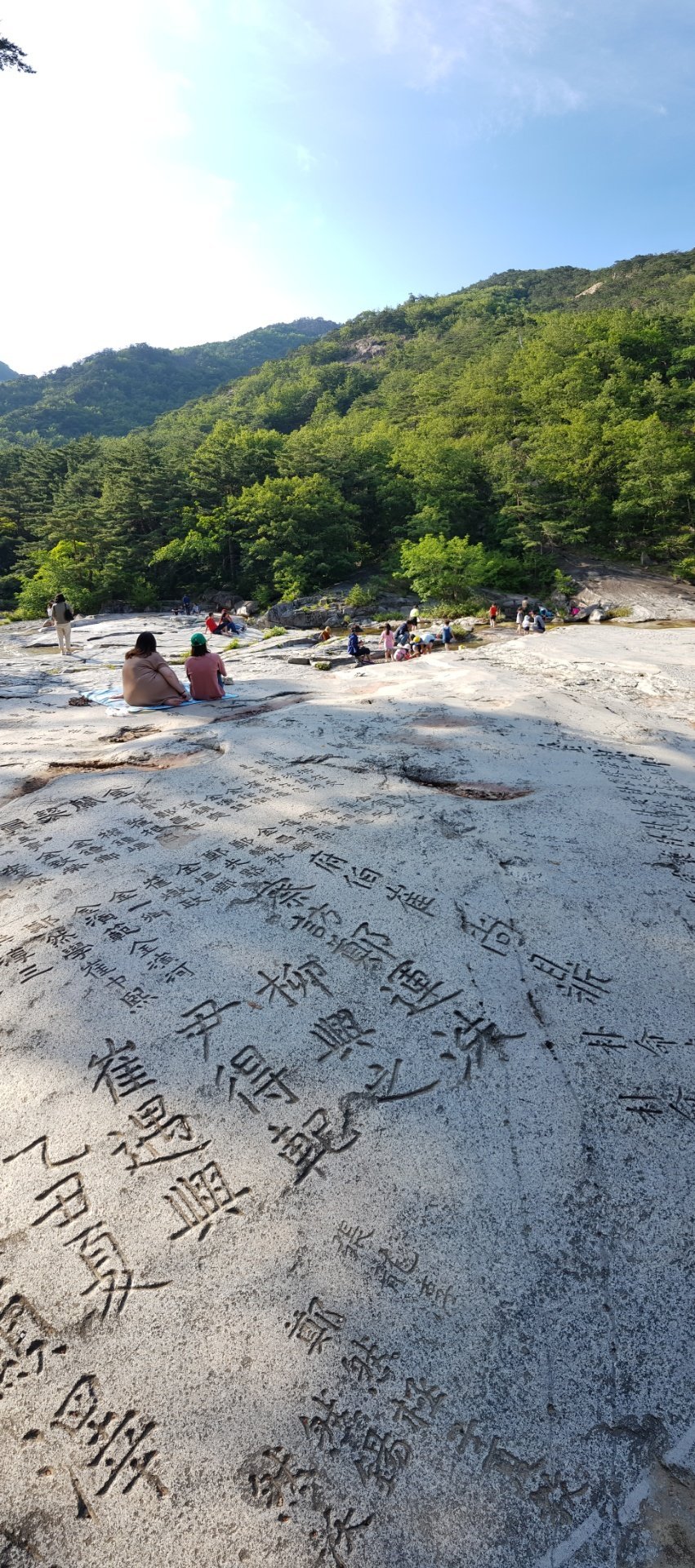 일주문을 빠져나오니 금란정 옆 계곡 운동장처럼 넓고 평평한 너럭바위 주변에 행락객들이 때 이른 물놀이를 즐기고 있다. 계곡 바위 바닥을 한지삼아 수많은 이름과 문구들이 한자로 빼곡히 새겨져 있다.