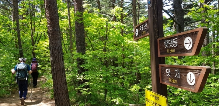 들머리 평탄하다 싶던 길이 오르막을 내놓는다. 한참을 걸어서 '햇댓등'이란 이정표를 만났다. 산행대장의 우려대로 평탄한 우회로를 두고 해발 963미터 봉우리 쪽으로 알바를 한 셈이다. 청옥산까지 간다는 산객도 있으니 두타산에서 하산한다면 이쯤 알바는 문제 될 것도 없을 것이다.