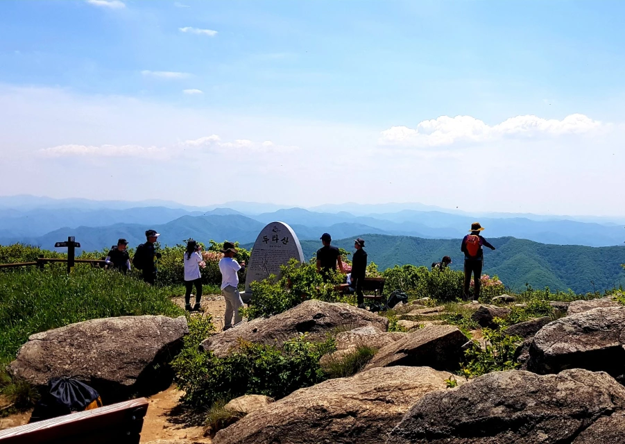 고지대의 비바람을 견뎌내느라 줄기가 뒤틀리고 굽은 신갈나무 군락과 철쭉 등 관목 지대를 지나며 정상이 가까워온다. 시야가 트이며 남쪽으로 먼 산군이 모습을 보인다.