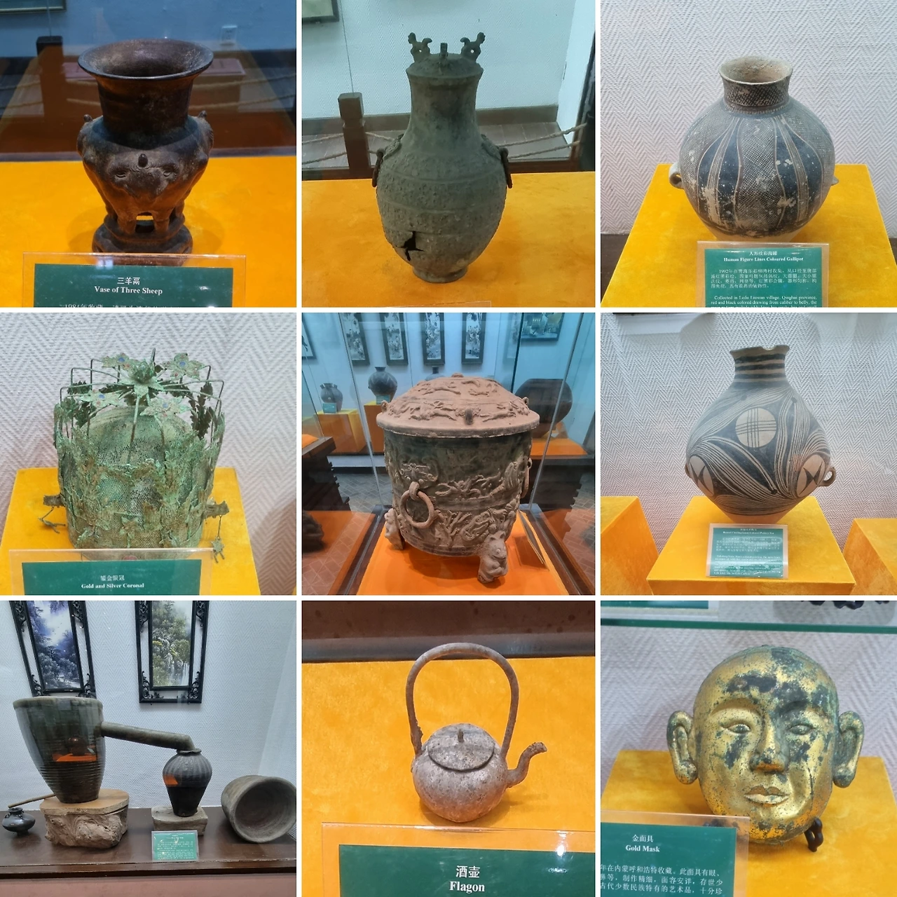 도기(陶器) 전시실에서는 북위 시기 북방민족 병사의 호기로운 모습을 담아낸 토용, 1992년 칭하이 러두(乐都)에서 수집한 인문(人文) 문양의 채색 도기, 1978년 간쑤 성 란저우에서 수집한 4656-4350년 전 등황 도기(橙黃陶), 1986년 간쑤 성 광허(广河)에서 수집한 4600년 전 도기, 몸통과 덮개에 동물 사냥하는 모습을 비롯 각종 동물과 새 등을 몸통에 아로새긴 전국시기 술통, 원형 기하학무늬의 마가요(马家窯) 문화 도기, 2022년 신장 투르판에서 수집된 거란의 귀족들이 쓰던 금은제 관, 2002년 내몽골 후허하오터(呼和浩特)에서 수집한 황금 마스크 등 특이한 유물들을 볼 수 있다.