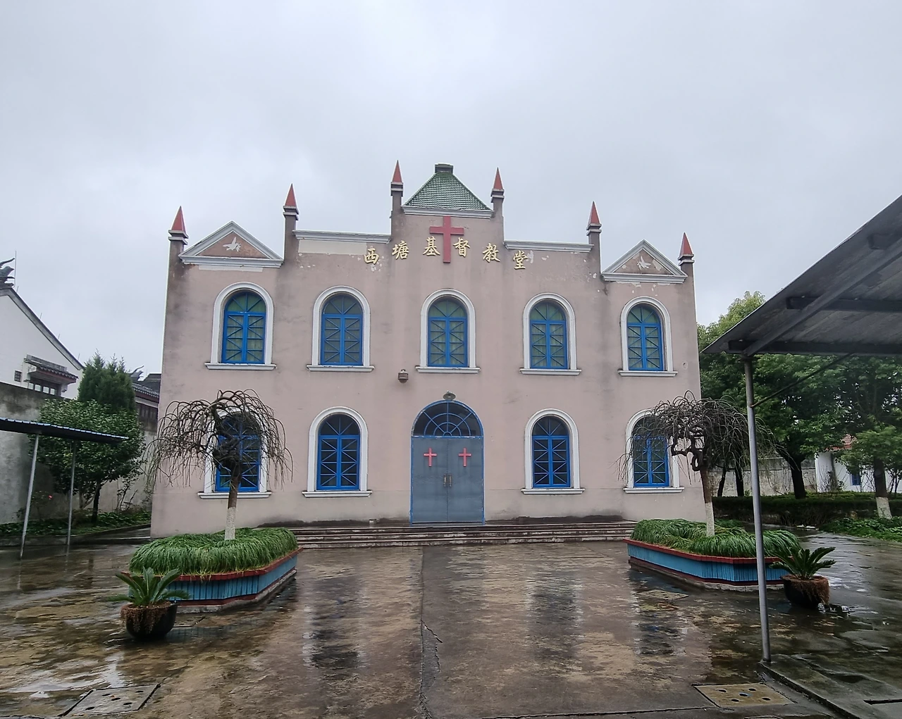 석피농으로 직행하기 전에 지도 앱에 나오는 '시탕 기독교당'으로 발길을 옮겼다. 건물 전면에 아치형 출입구와 아홉 개 창문을 내고 지붕에 여섯 개의 뾰족한 탑을 가진 양식이 독특하다. 안쪽에 인기척이 있어 굳게 잠겨 있는 철제 대문을 두드리니 한참만에 할머니 한 분이 문을 열어준다.