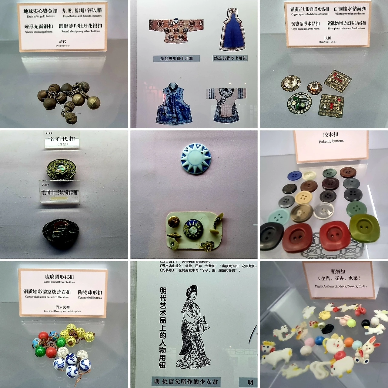 비는 아직도 오락가락하고 오후도 절반이 지나고 있어 귀로에 오를 요량으로 서가(西街) 거리를 빠져나오려는데 '단추(纽扣) 박물관'이라는 현판이 발길을 잡는다. 진, 한, 위진남북조, 송, 명, 청, 민국 시대의 혁대 버튼, 벨트 고리, 단추 등 복장 결구 유물을 비롯해서 그 시대 의복들을 그림으로 설명하고 있다. 전시된 유물들도 감동을 불러일으키지만, 수 천 년에 걸친 유물들을 수집하고 고증하여 한 자리에 모으기까지 얼마나 많은 사람들의 노고와 집념이 필요했을지 가늠이 되지 않는다.
