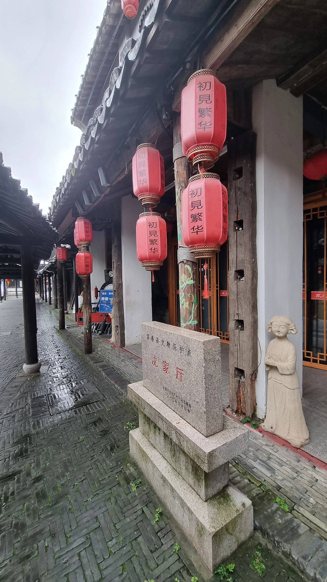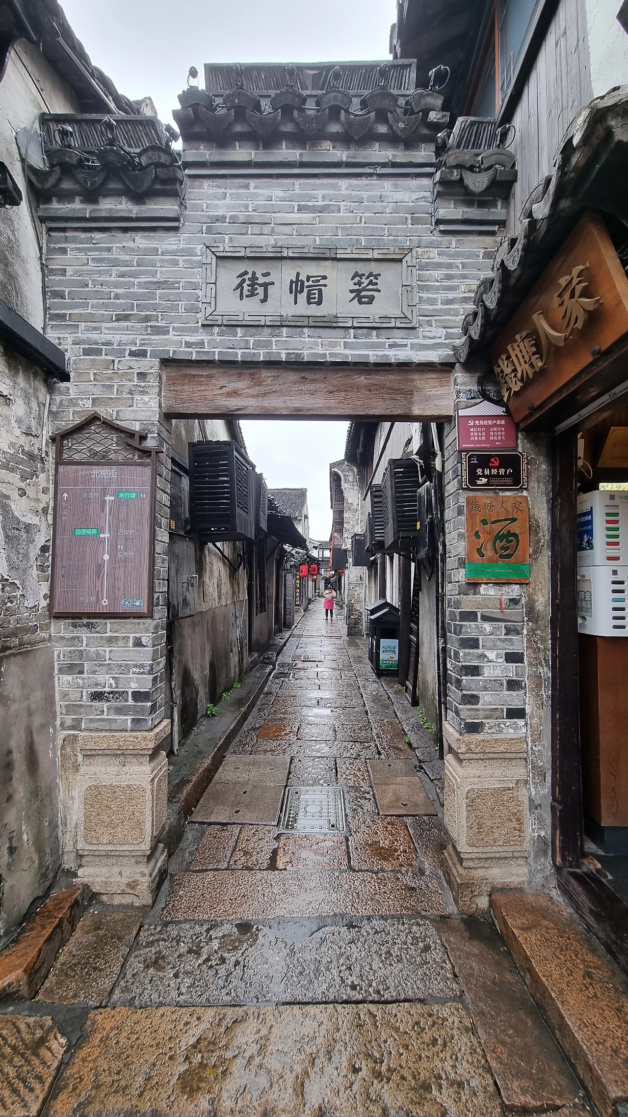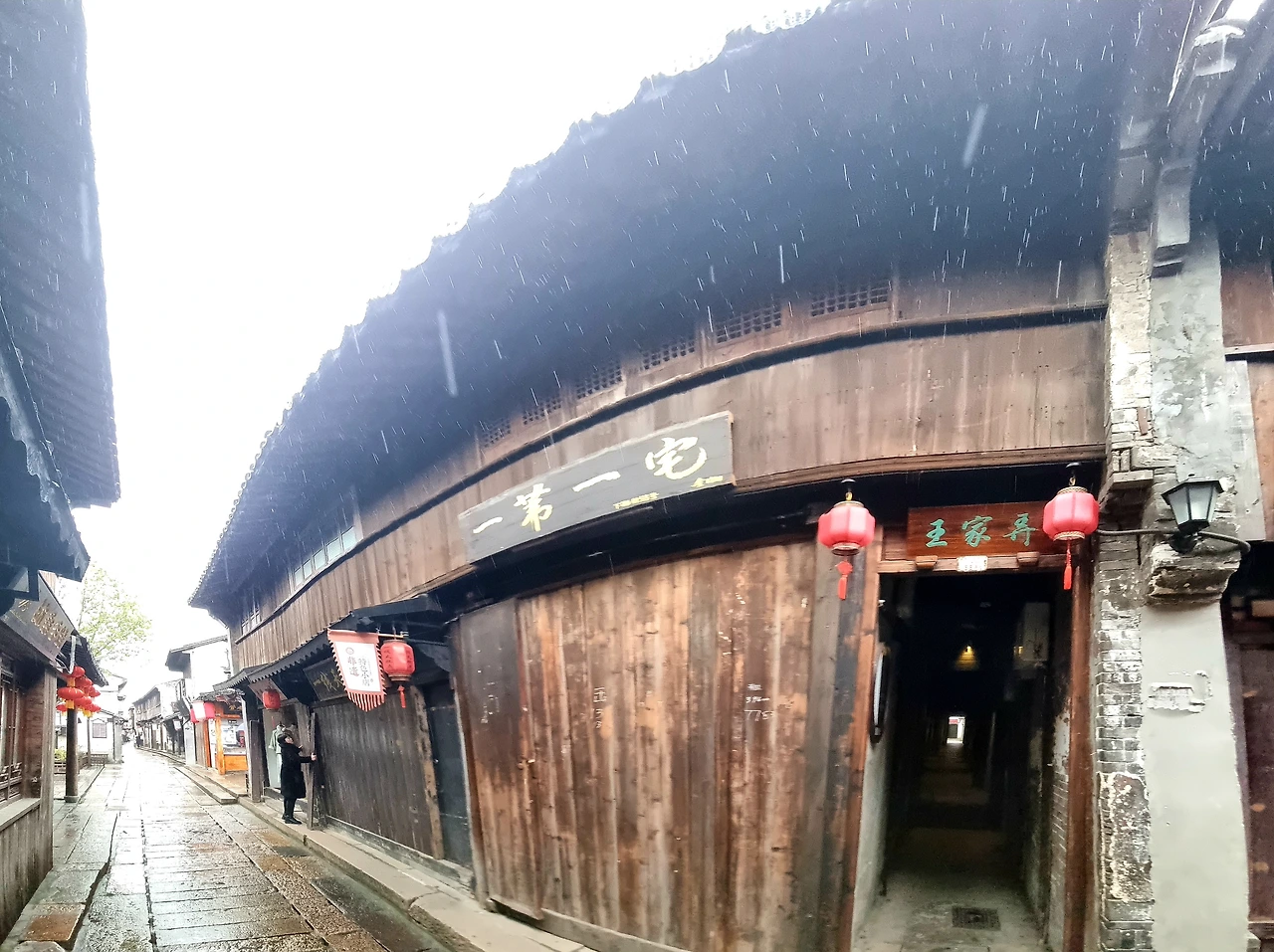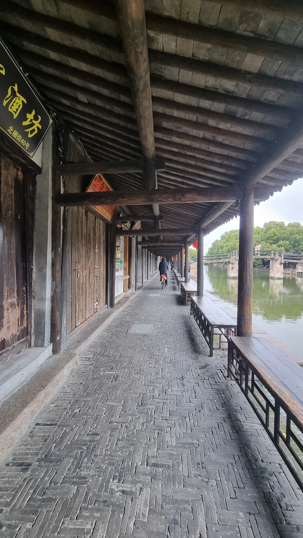 수로를 낀 연우장랑(烟雨长廊)을 따라 들어서서 북책가로 들어섰다. 장랑은 남북책(南北栅) 등 수로를 마주한 상가 골목에 벽돌과 목재로 지은 폭 2-2.5m, 길이 1km의 거리다. 햇빛을 차단하고 비를 피할 수 있도록 한 젊은 과부가 운영하던 음식가게 앞 도로에 지붕을 얹은 것에서 시작되었다는 장랑은 강남 수향 가운데 이곳에서만 볼 수 있는 독특한 볼거리이다. 마침 오늘처럼 비가 흩뿌리는 날 그 이름에 걸맞은 옛 수향의 장랑을 거니는 운치가 남다르다.