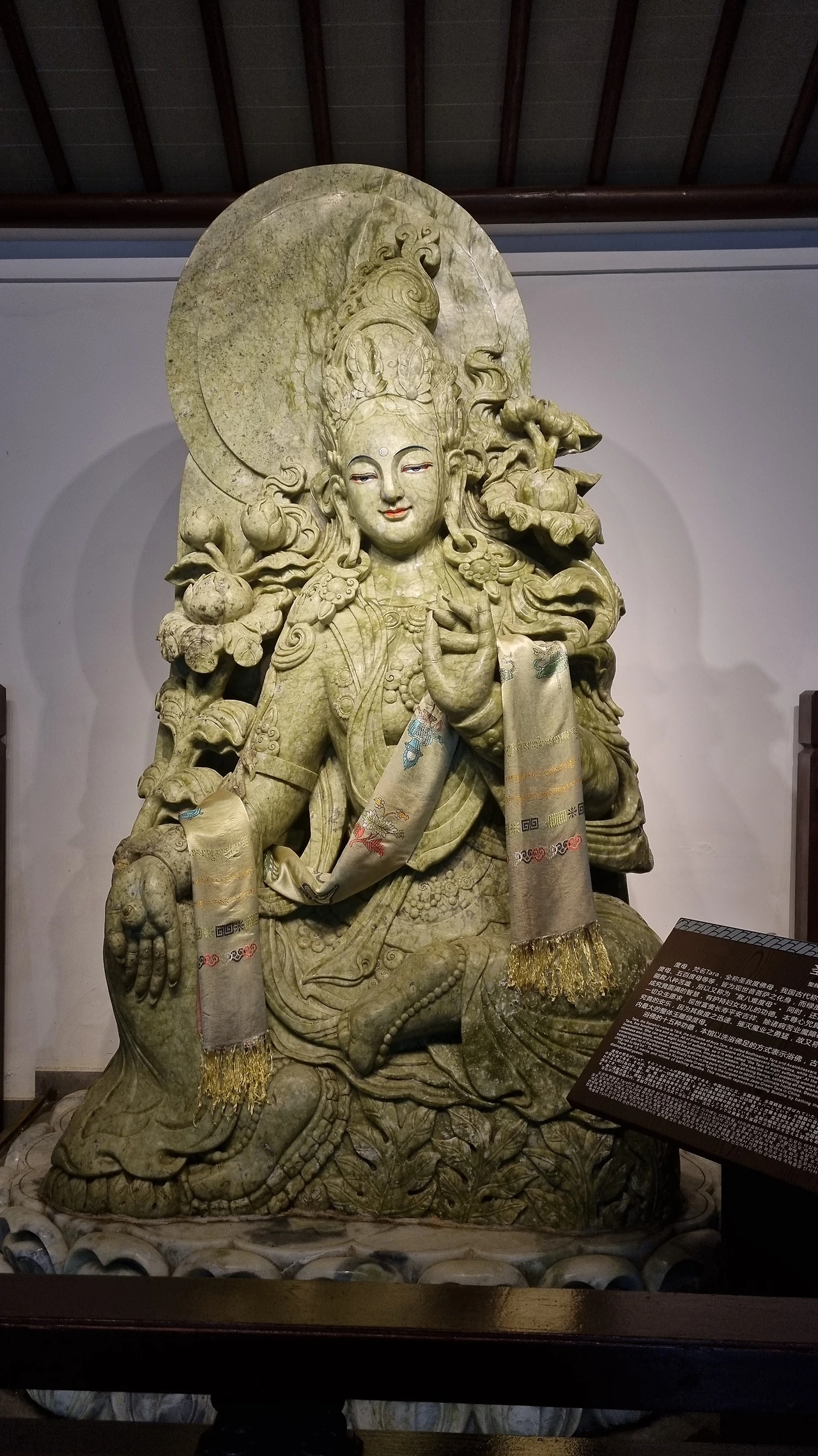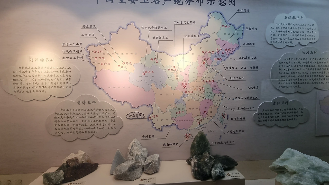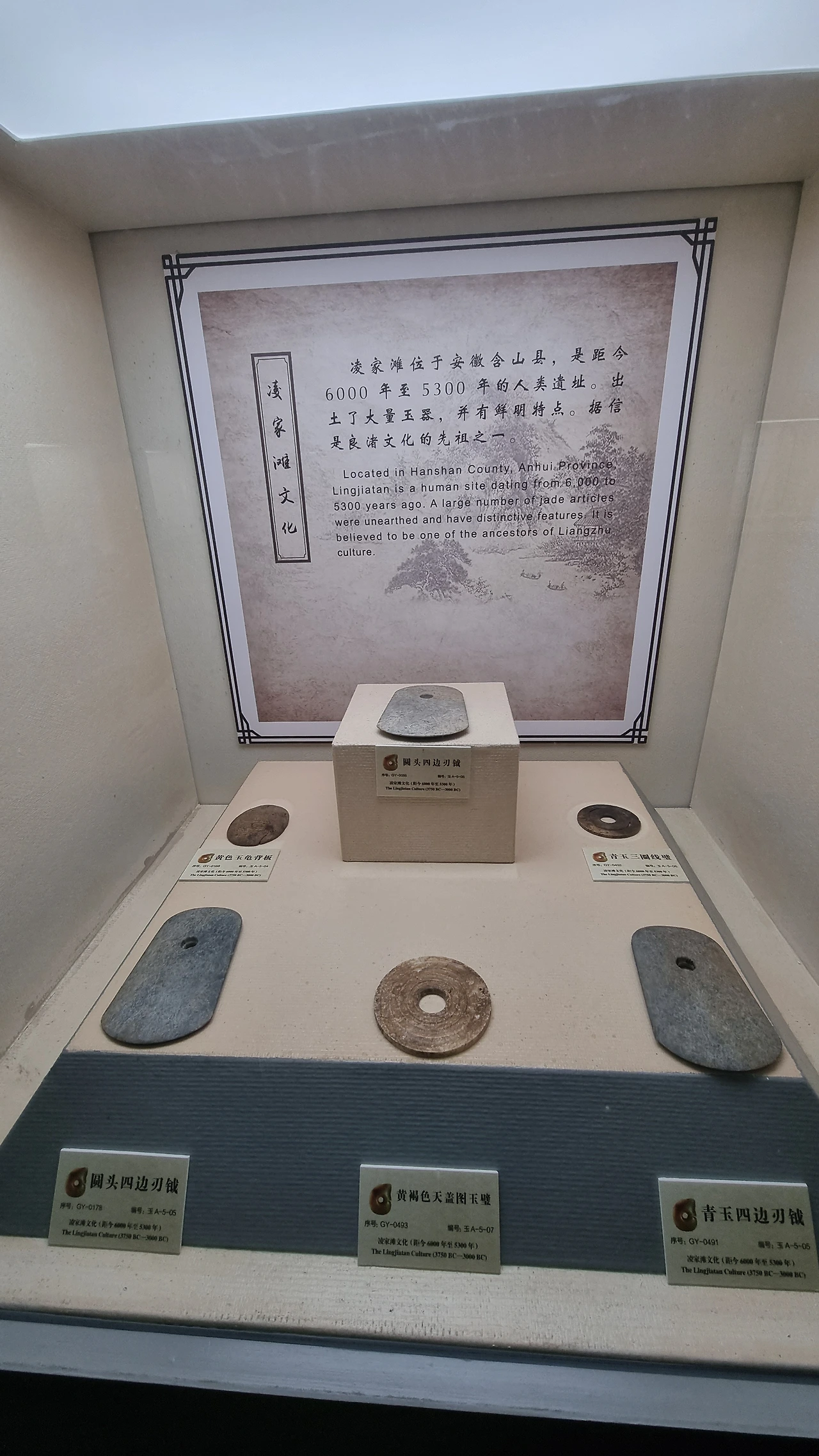 거대한 옥으로 조각한 관음보살상이 맞이한다. 전시실에는 1만 2천 년 전 구석기시대 타제 옥 공구와 장식품들을 시작으로 홍산(红山), 낭저(良诸), 안후이 릉가탄(凌家滩 BC5300-6000) 등 고대문화 유적지에서 출토된 소박한 옥기들이 설명과 함께 전시되어 있다. 제가(齐家, BC3~4000년), 용산(龙山, BC3500~4000년) 문화를 거쳐 하상주 시대로 이어지면서 예술적 아름다움이 가미된 작은 장식품 위주의 옥제품들 등장하는 것을 볼 수 있다.