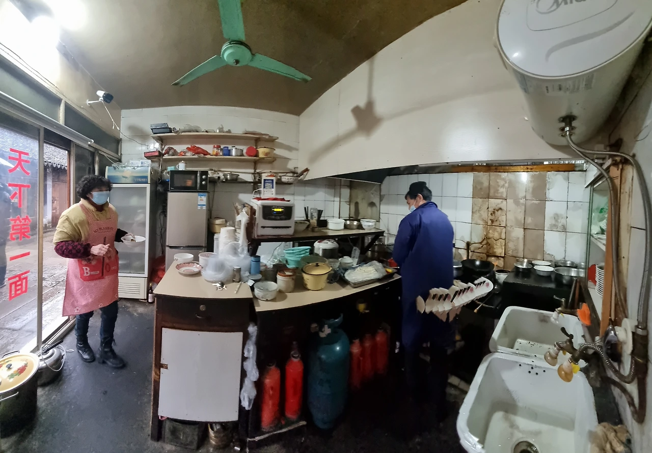 전가복(全家福), 홍삼선(红三鲜) 등 이 지역 별미(特色面) 가운데 4천 원 남짓 하는 찰육폭어면(扎肉爆魚面; 쟈러우바오위미엔) 한 그릇을 주문했다. 식탁 네댓 개가 놓인 식당 홀과 비슷한 넓이의 주방에서 주인 부부가 함께 주문한 국수 한 그릇을 만들어서 금세 내어온다.
