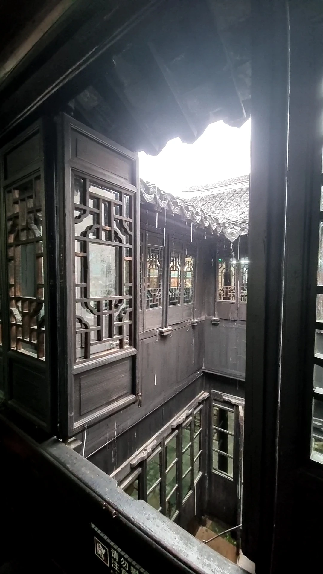 전시실 2층 창문을 내다보니 오밀조밀 겹칠듯 엇갈리며 이어진 지붕과 담벼락의 열린 공간, 그 사이로 뚫린 손바닥만한 하늘과 기와지붕 처마에서 그칠줄 모르고 빗줄기가 내리치고 있다.