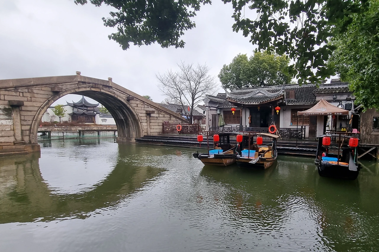 남쪽 중앙에 자리한 출입구로 들어서서 곧게 뻗은 수로를 따라 구쩐의 북쪽 끝 와룡교(卧龙桥) 쪽으로 향한다.