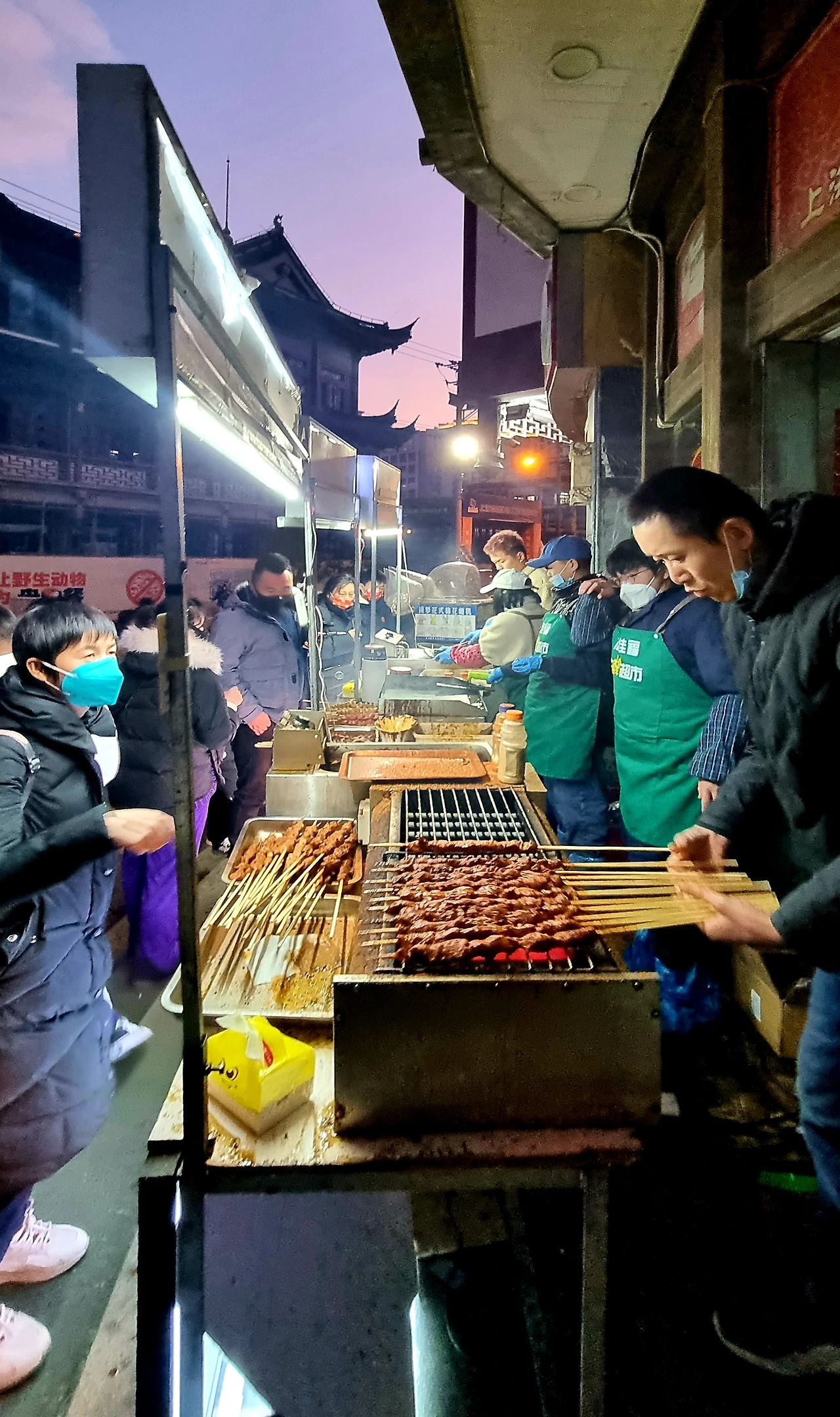 예원 상가 가장자리를 한 바퀴 휘돌며 노상의 양꼬치 구이도 하나 맛보았다. 인파로 넘치는 대궐 같은 예원 상가 기와집들은 처마꼬리를 잔뜩 치켜든 채 휘황한 불빛 조명에 불타 오르고 있다.