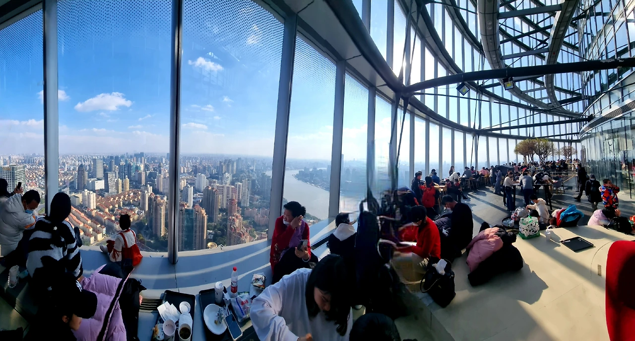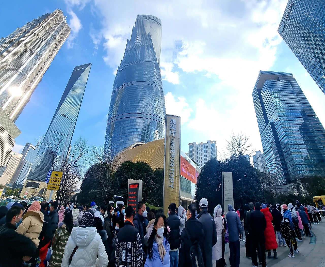 세계금융센터 빌딩 옆을 지나 상하이센터 빌딩 쪽으로 발을 옮겼다. 상하이 핫스폿 가운데 하나인 '둬윈서원(朵云书院)'이 그 빌딩 52층에 자리하기 때문이다. 빌딩 입구에는 전망대 티켓을 구하려는 사람들이 끝이 보이지 않는 긴 줄을 지어 서있다.