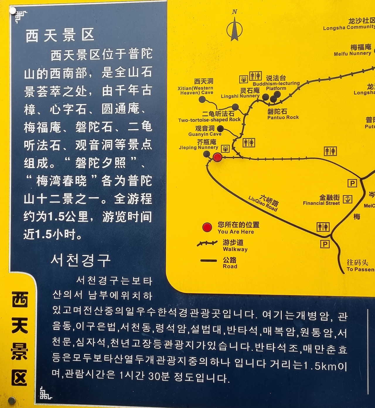 그 북쪽의 능선을 따라 서천경구(西天景区)가 어제 들렀던 보제사까지 약 1.5km가량 펼쳐져 있다. 바위 능선을 따라 관음고동(观音古洞), 이구청법석(二龟听法石), 반타석(磐陀石) 등 수많은 볼거리들이 모여 있다니 자못 기대가 된다.