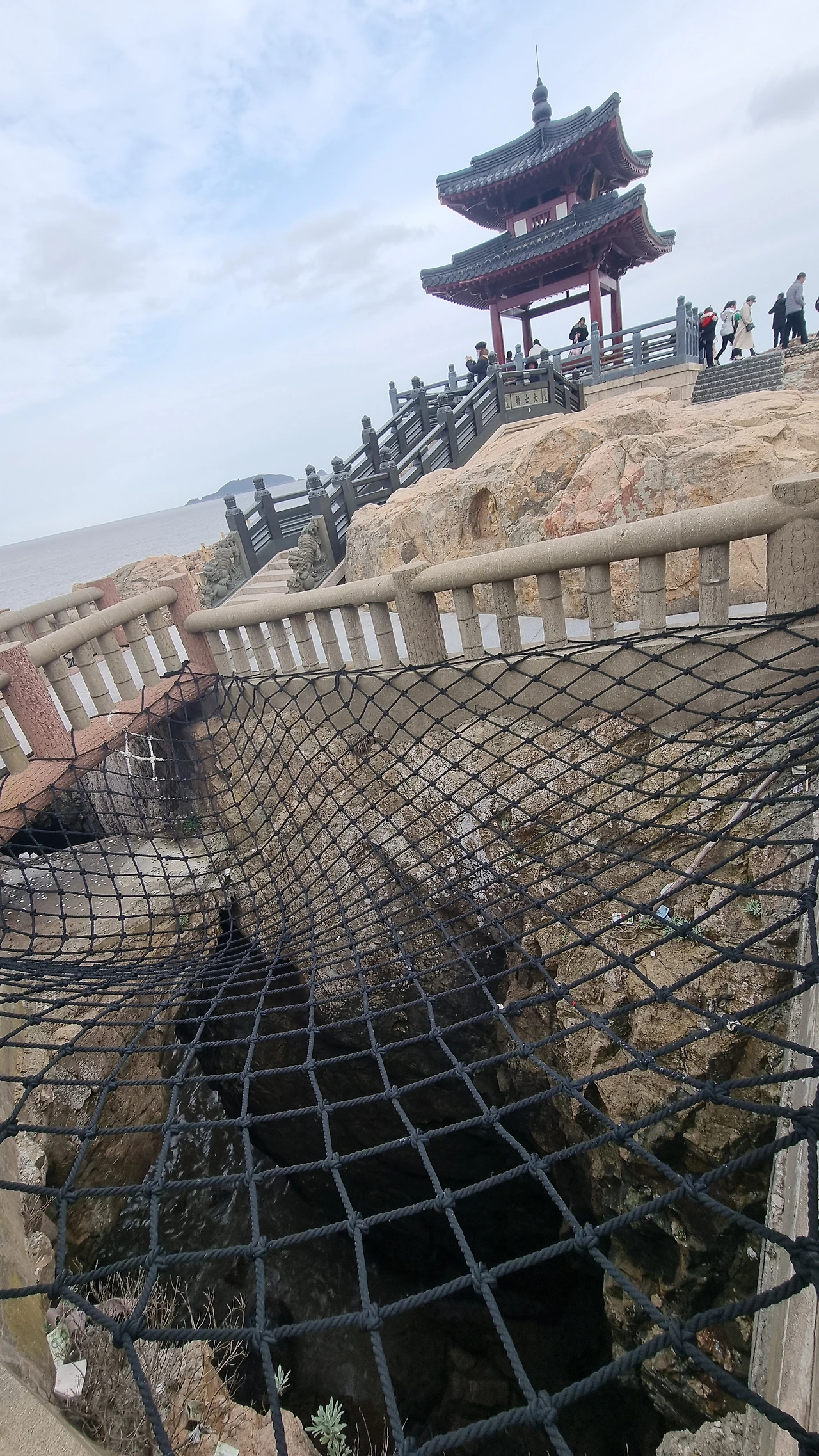 사람들 발길은 능선 아래쪽에서 관음고동으로 난 좁고 긴 돌계단 길을 따라 끊이지 않고 이어진다. 고동 뒤쪽으로 난 돌계단을 휘돌아 산마루 위 극락정(极乐亭)이 자리한 가장자리에 올라섰다. 저우산 섬 사이에 너른 바다를 온전히 드러내 보여주는 툭 트인 전경을 한동안 조망했다.