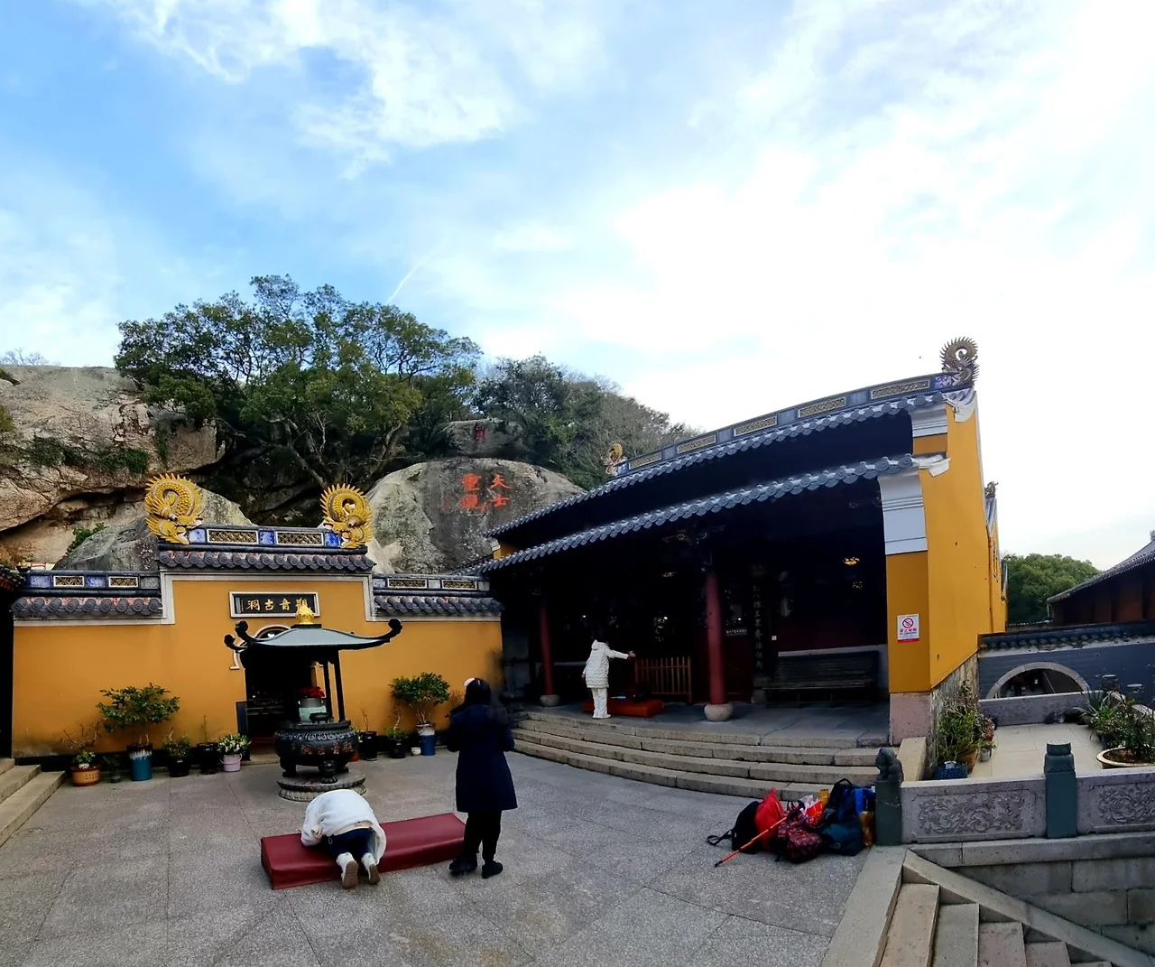 지척 거리에 있는 관음고동(觀音古洞)의 '관자재(觀自在)', '관세음보살' 등 글귀가 쓰인 담장을 지나 사원 경내로 들어섰다. 돌계단 위 마당 건너편 암벽 아래 석굴에 석불 세 좌를 비롯해서 여러 불상을 모셨다. 관음성지답게 석굴 오른편에는 관음보살상을 모신 원통보전이 번듯하게 자리한다.
