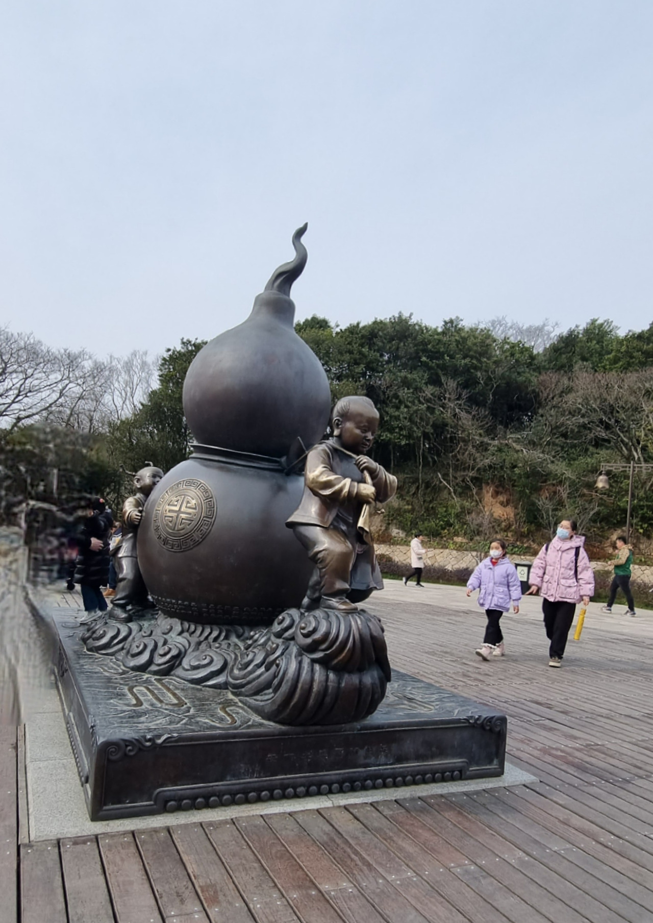 사십여 분만에 해발 약 290여 미터 불정산(佛顶山) 정상에 올라서니 여러 명의 동자들이 큰 조롱박을 끄는 기념 조형물 맞이한다. 바윗돌에 새겨진 '올라오니 좋구나(上来就好)'라는 문구처럼 고된 발걸음의 수고로움 끝에 올라서는 산정은 높이를 떠나 감흥이 남다르기 마련이다.