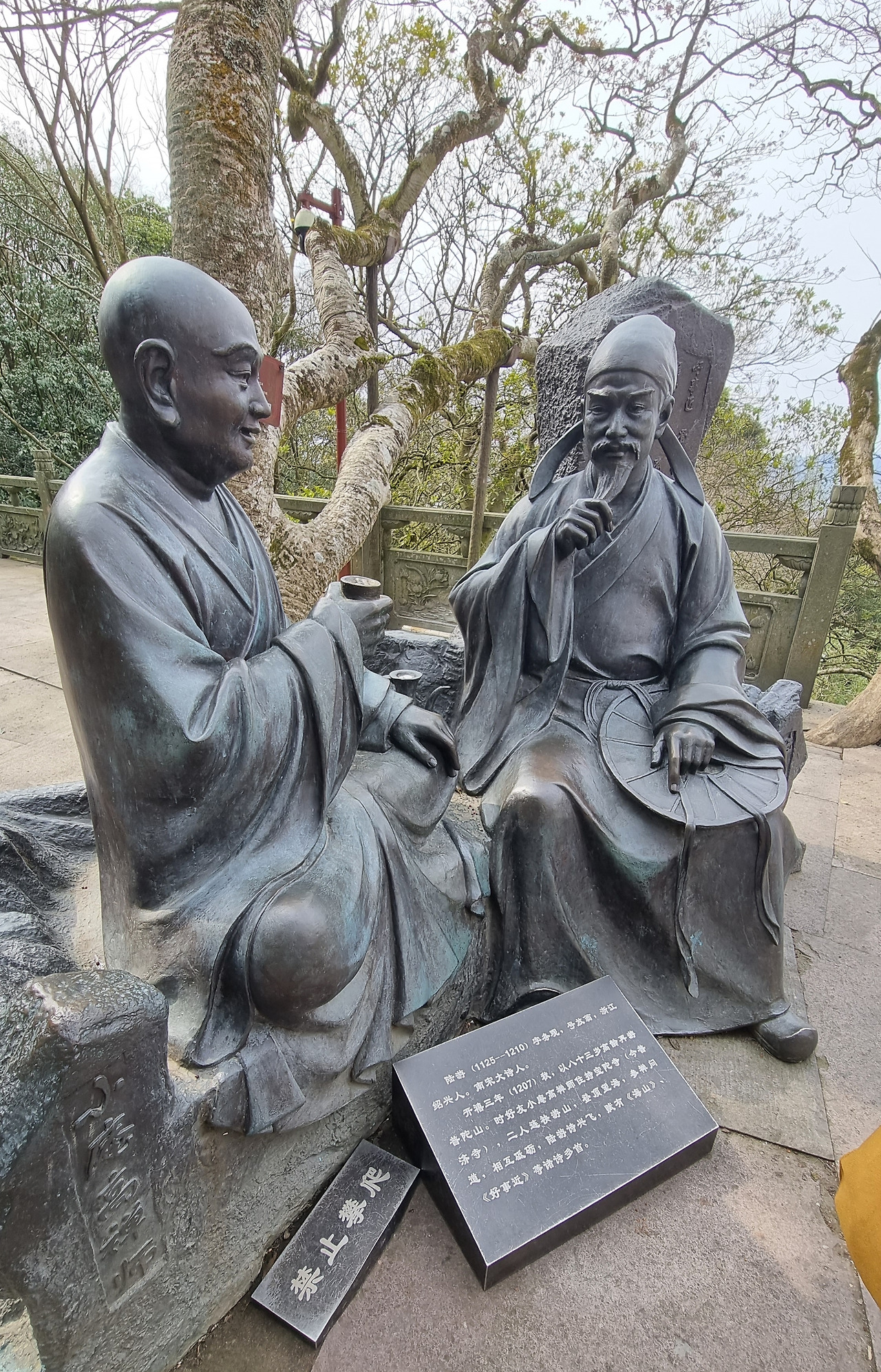 남송의 시인 육유(陆游, 1125-1210)가 83세 고령에 이곳을 방문해서 보타사(현 보제사) 주지 소암(小庵) 고선사와 함께 산정에 올라 바다를 바라보며 도를 논하고 <해산(海山)> 등의 시를 남겼다고 동상 앞 안내판이 설명한다.