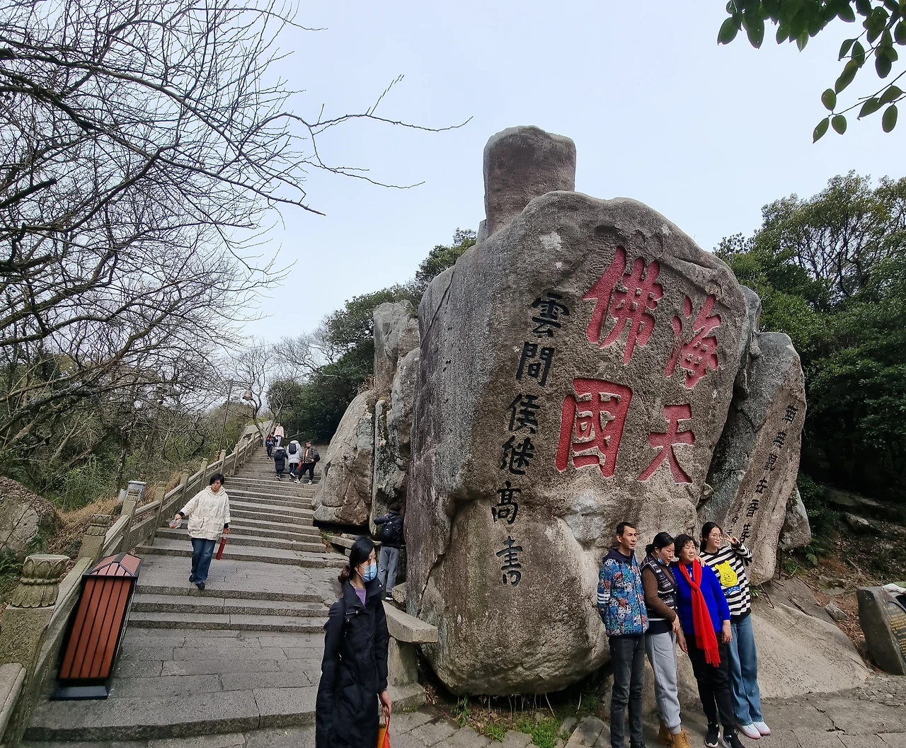 발걸음이 버거워질 즈음 '해천불국(海天佛国)' 한자 각인이 커다란 바위 위에서 산 아래쪽을 굽어보고 있다. 명나라 때 왜구 퇴치로 이름을 날린 후지계(侯继高, 1533-1602) 장군이 새겼다는 이 글귀는 보타산 승경을 잘 표현하고 있어 보타산의 별칭이 되었다고 한다.