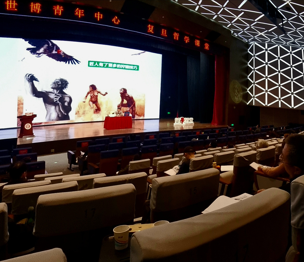 박물관 1층 기념품점을 훑어보고 복도 안쪽 강당을 들여다보니 푸단대학의 철학학당(哲学课堂) 강의가 진행되고 있다. 계단식 극장처럼 큰 강당의 출입문 쪽 맨 뒷줄에 앉아 고대 원시인류의 기원과 진화에 대한 강의에 잠시 눈과 귀를 기울였다.