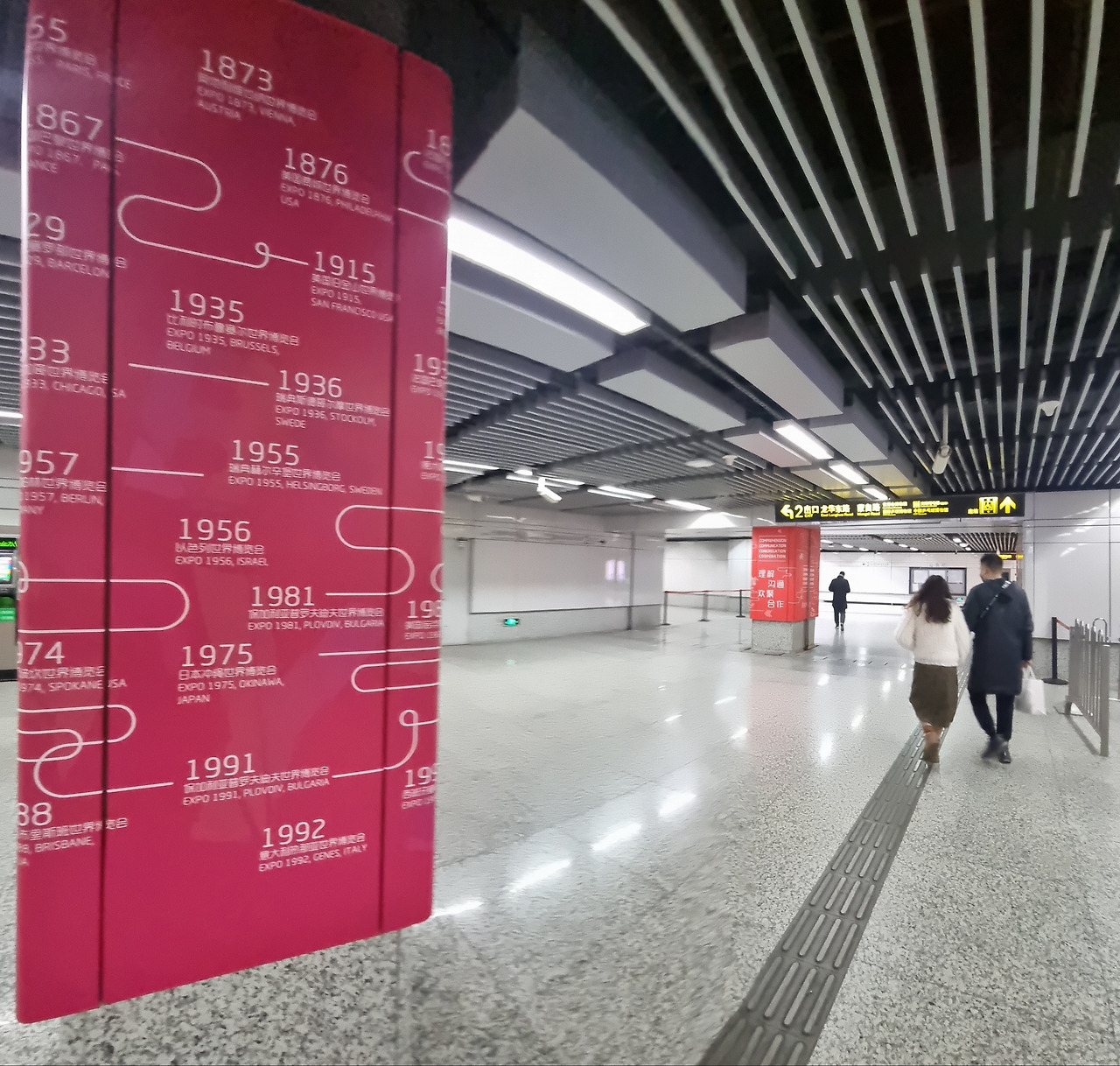 2층으로 올라가는 에스컬레이터와 계단 양쪽 벽면에는 19세기에 개최된 엑스포의 아름다운 포스터들이 나란히 걸려 있다. 제2전시실 주제는 '진보지로(進步之路; Moving with Progress)'로 도시변화, 과학기술 혁신, 세계여행의 3개 코너로 나뉜다. 전시관에는 1873년 비엔나로부터 1915년 샌프란스코까지 각국에서 개최된 엑스포 개최 건물과 도시 모습이 미니어처와 사진 등으로 설명하고 있다.