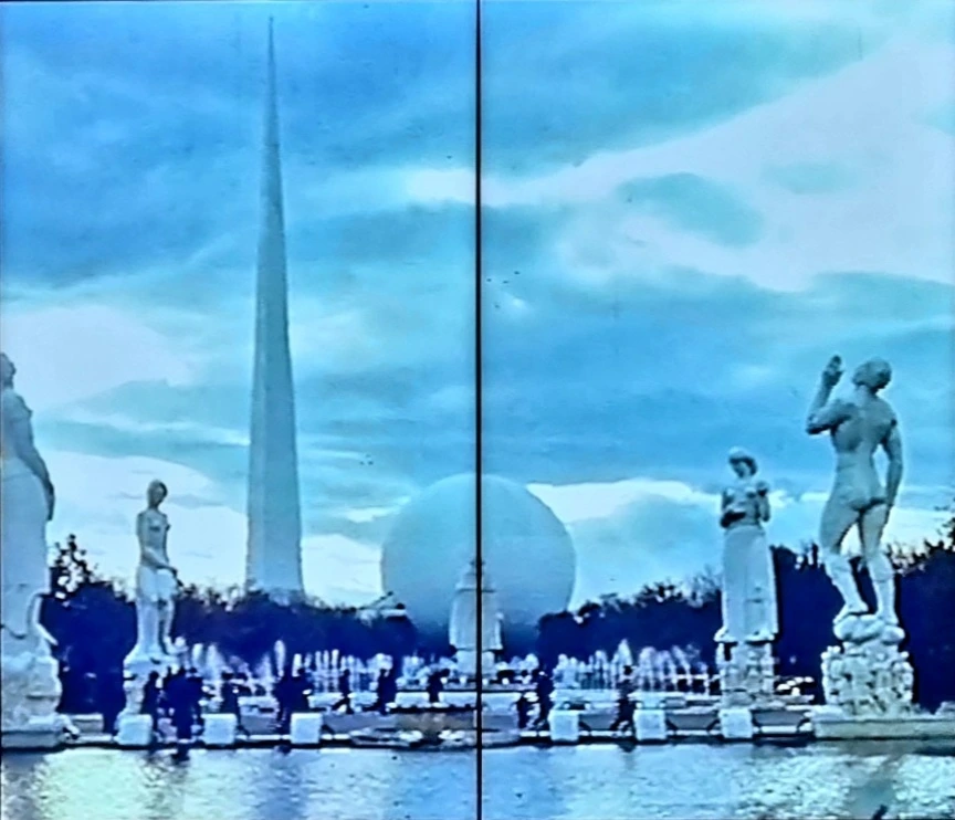 제1전시관 한가운데에는 파리 엑스포를 조명하는 대형 영상이 나오고 있다. 영상은 1855년부터 한 세기 동안 6번이나 엑스포를 개최하여 엑스포의 도시라고 해도 될법한 파리의 변화 발전하는 모습을 보여주는데, 조감도 형식 도시 전체를 조망하는 파노라마 영상이 파리의 도시 형성 과정을 이해하는데 많은 도움을 준다.