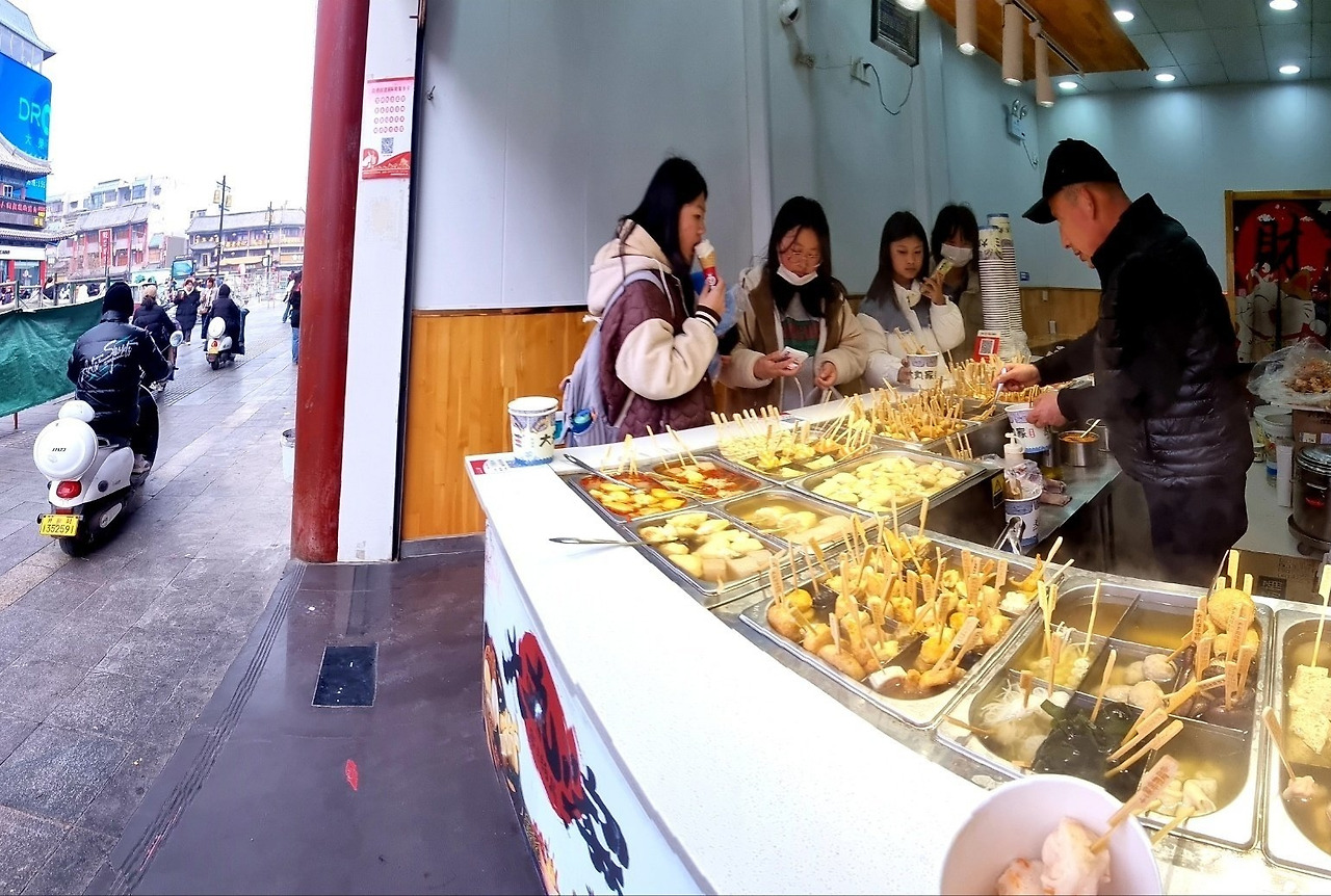 홍교를 건너자 비파를 타는 대형 선녀상이 맞이하는 광장이 나온다. 어떤 가게 앞에서 훈제한 닭을 큰 칼로 썰고 있어 가까이 다가가니 살코기 한 점을 건네며 맛보라고 한다. 암탉을 오리나 돼지고기 육수에 한약재와 향신료를 넣어 삶아낸 이 지역 고유의 요리 '통즈지(桶子鷄)'라고 하는데 짠맛이 강하다.