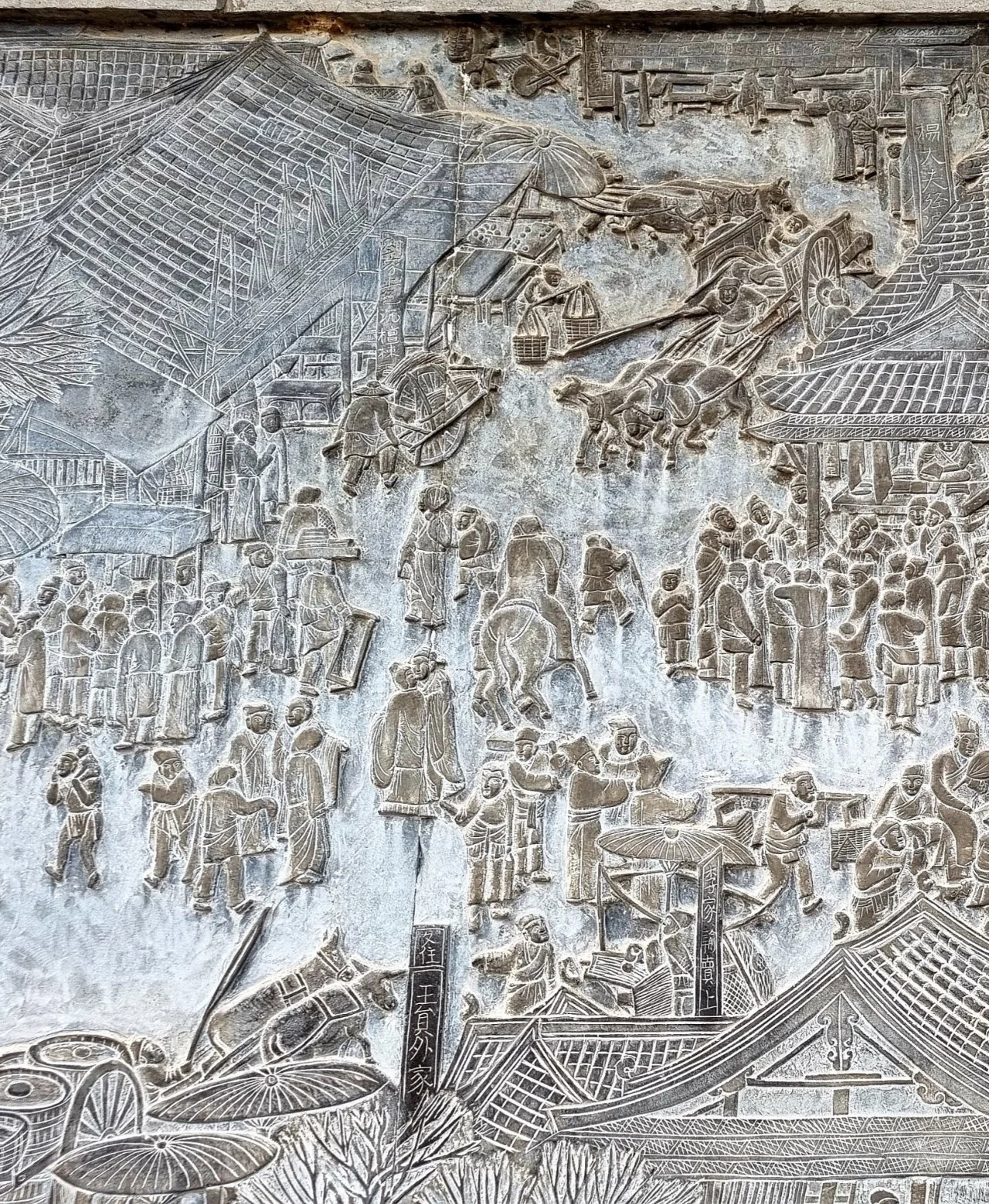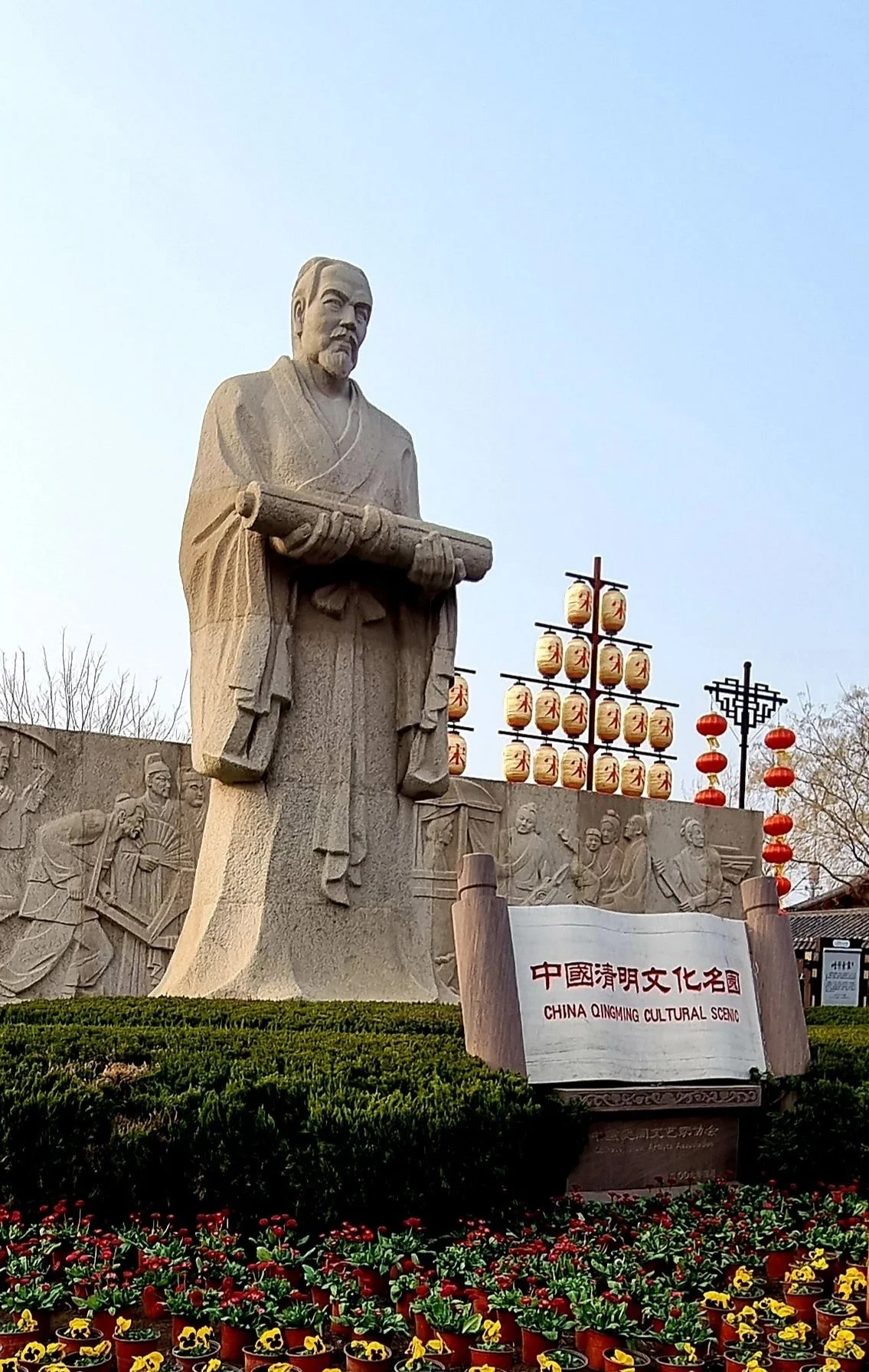 매표소부터 관람객들이 넘쳐난다. 당초에는 그림 속 정취를 그대로 느껴볼 요량으로 청명절인 4월 5일에 맞추어 이곳을 찾아볼 계획이었다. 수많은 인파를 보니 당초 계획을 앞당겨 일찌감치 찾아오기를 잘했다는 생각이 든다. 입장표를 사서 입구로 들어서니 청명상하도 그림을 큰 석벽에 새긴 부조가 맞이한다.
