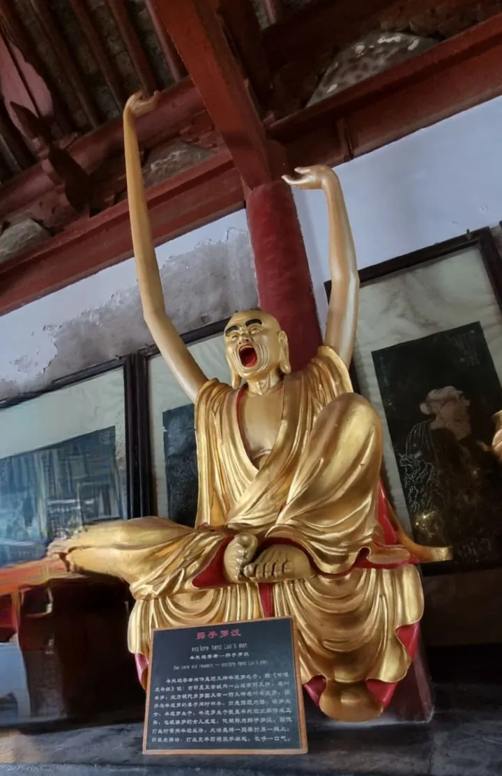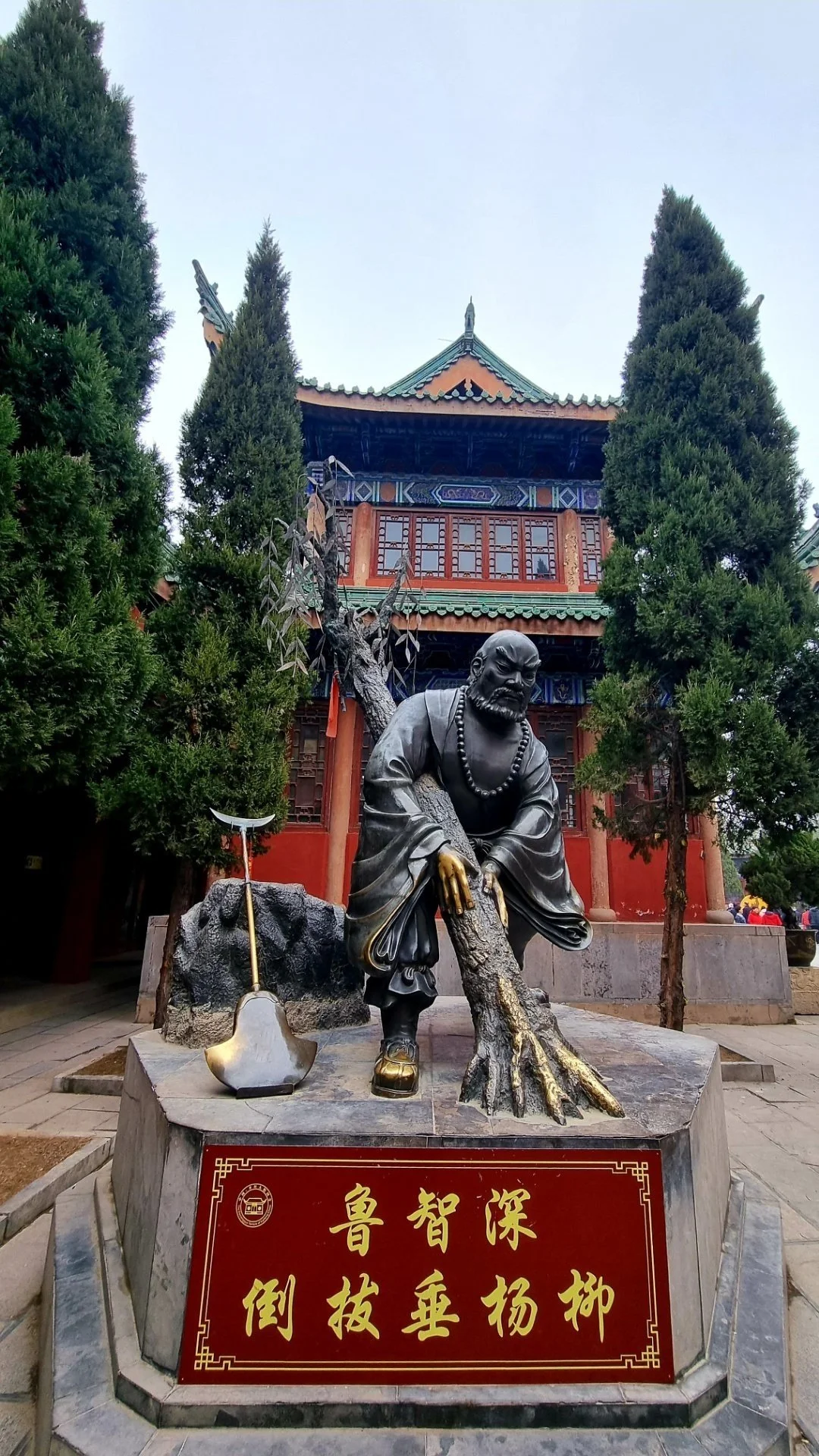 산문으로 들어서니 계단 아래 넓은 마당 너머 천왕문이 보이고 그 좌우로 고루와 종루가 마주 보며 자리한다. 좌측 고루에는 재신 관우, 종루에는 지장보살의 조상(彫像)이 각기 좌정하고 있다. 고루 앞에 버드나무를 뽑는 노지심(鲁智深) 동상이 눈에 들어온다.