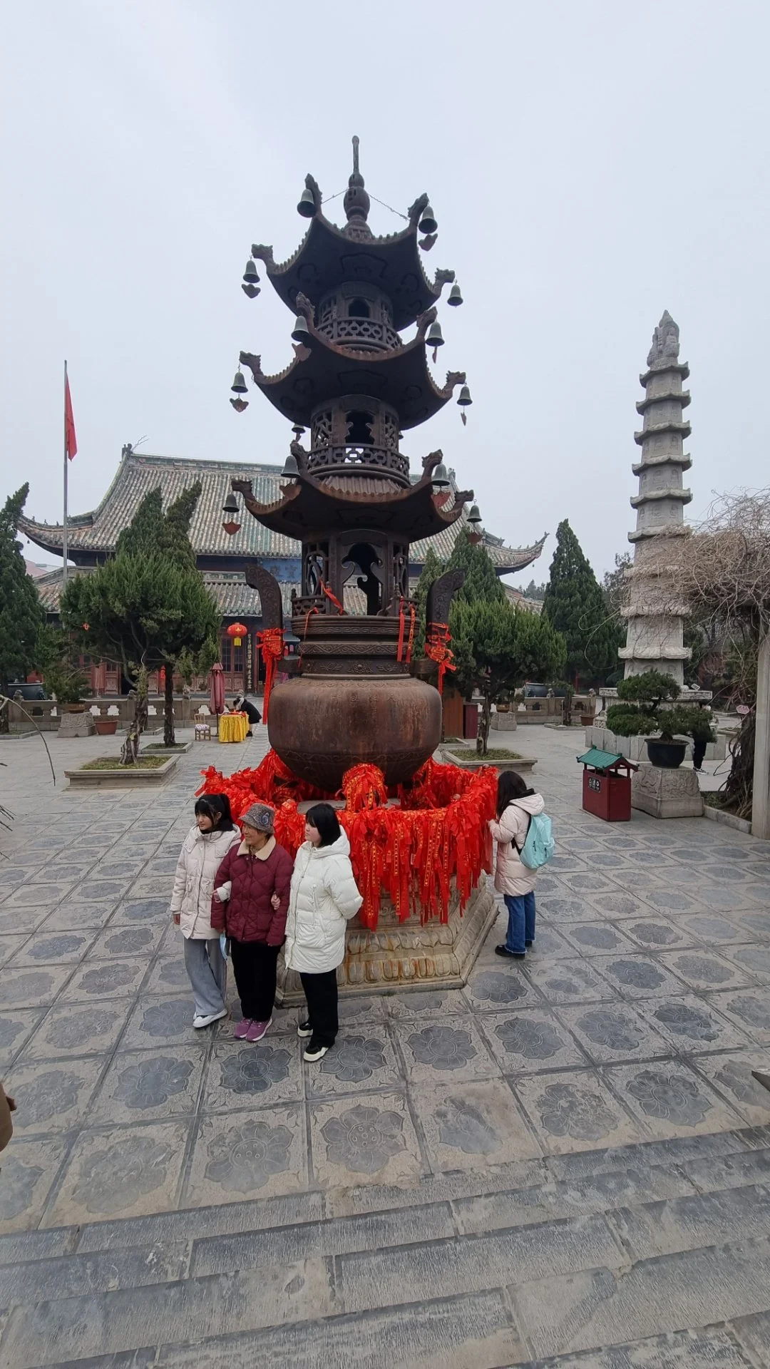 주 건물들을 따라 난 종축 바닥 꽃무늬 벽돌이 정교하고 아름답다. 천왕전과 대웅전 사이에는 방생지가 자리하고 그 위에 걸린 아치형 석교가 아름답고 연못 속 거북과 학 조각상은 수려하다. 석교를 건너면 대형 철제 향로 탑과 그 양쪽에 탑신 각 층 각 면마다 불상을 돋을새김 한 팔각구층 석탑이 나란히 자리한다.