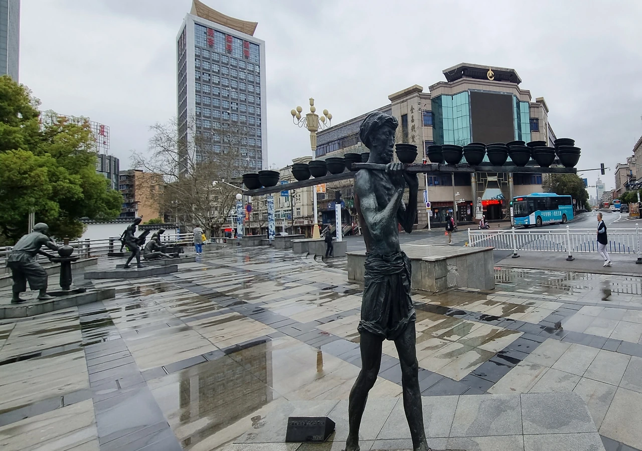 주산대도(珠山大道) 도로변 청화백자 기둥의 가로등과 광장과 접해 있는 너른 보행로의 도자기를 빚거나 운반하는 도공들의 조상(雕像) 등이 도자기 도시의 중심이 와 있음을 실감케 해 준다. 거리에서 계단을 따라 사방이 수목으로 조성된 화단에 둘러싸인 석재 바닥의 광장으로 내려섰다.