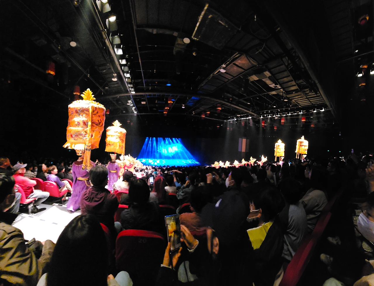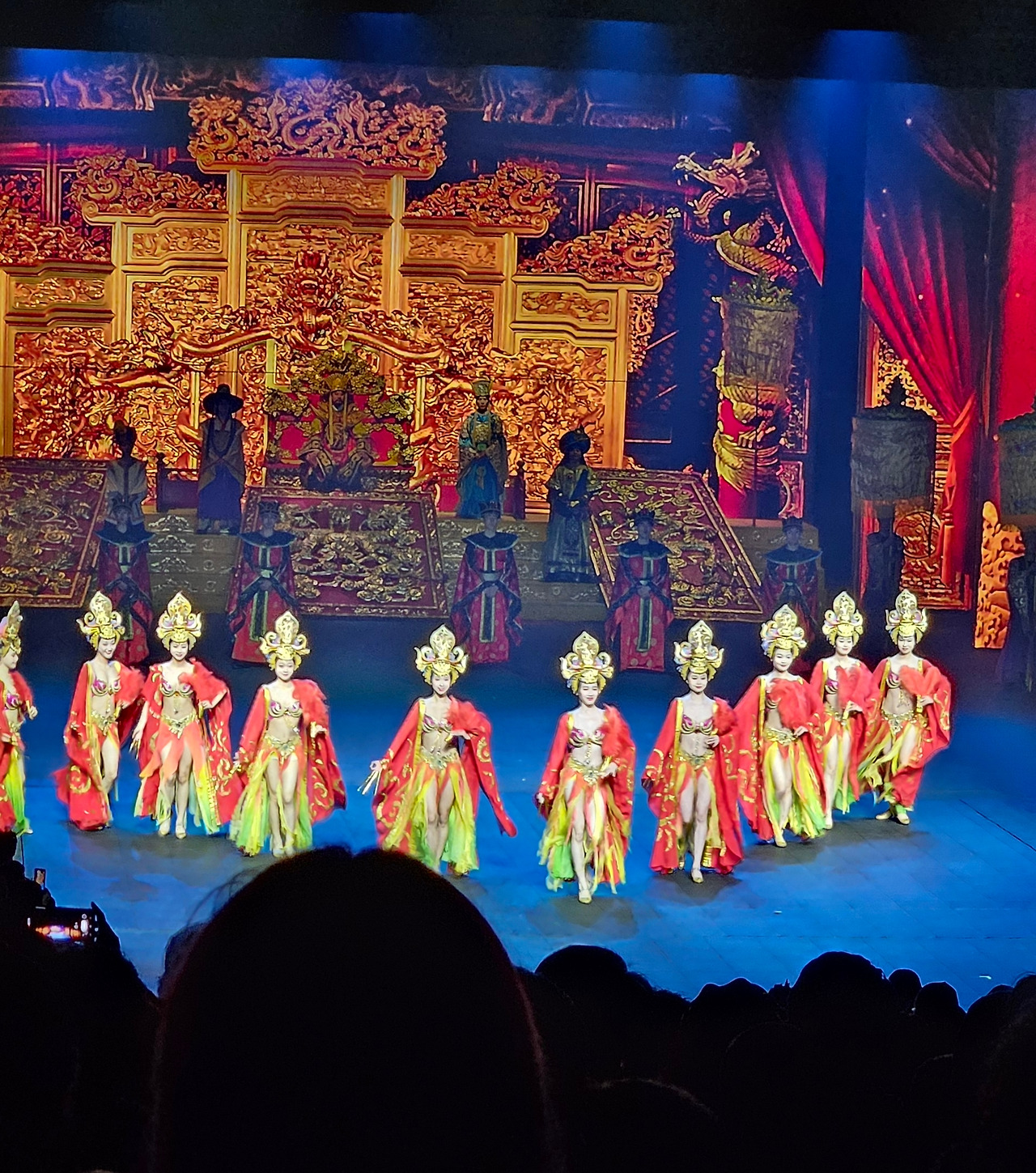 티켓을 예매하는 대형 홀을 지나고 수로 위에 놓인 다리를 건너서 가무쇼가 열리는 공연장으로 향하는 관람객들이 인산인해를 이루었다. 2500명이 입장 가능하다는 대형 실내 공연장은 빈자리가 없이 만원이다. 가이드가 송청 입구에서 단체 패키지 여행단 깃발을 꺼내 들었음에도 일행 중 한 명이 보이지 않지만 일행에게 좌석을 안내한 후 공연장 밖에서 구 분을 찾아서 데려오는 가이드의 침착함이 돋보인다.