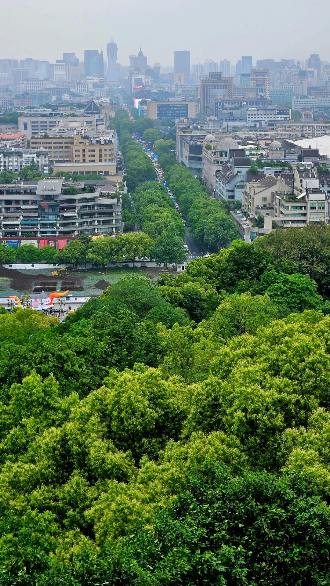 가이드의 안내에 따라 일행은 1층에서 엘리베이터를 타고 곧바로 조망처 4층으로 올랐다. 난간 둘레를 돌며 조망하는 서호와 항저우 시내 모습이 가히 일품이다. 습기를 머금은 흐린 공간 멀리 항저우 시내의 고층 빌딩숲과 하늘이 경계를 이루고, 성황각 난간 밖 발아래에는 향장목이 햇빛에 윤슬처럼 반짝이는 무성한 연녹빛 잎사귀를 바람에 일렁이며 춤추고 있다.