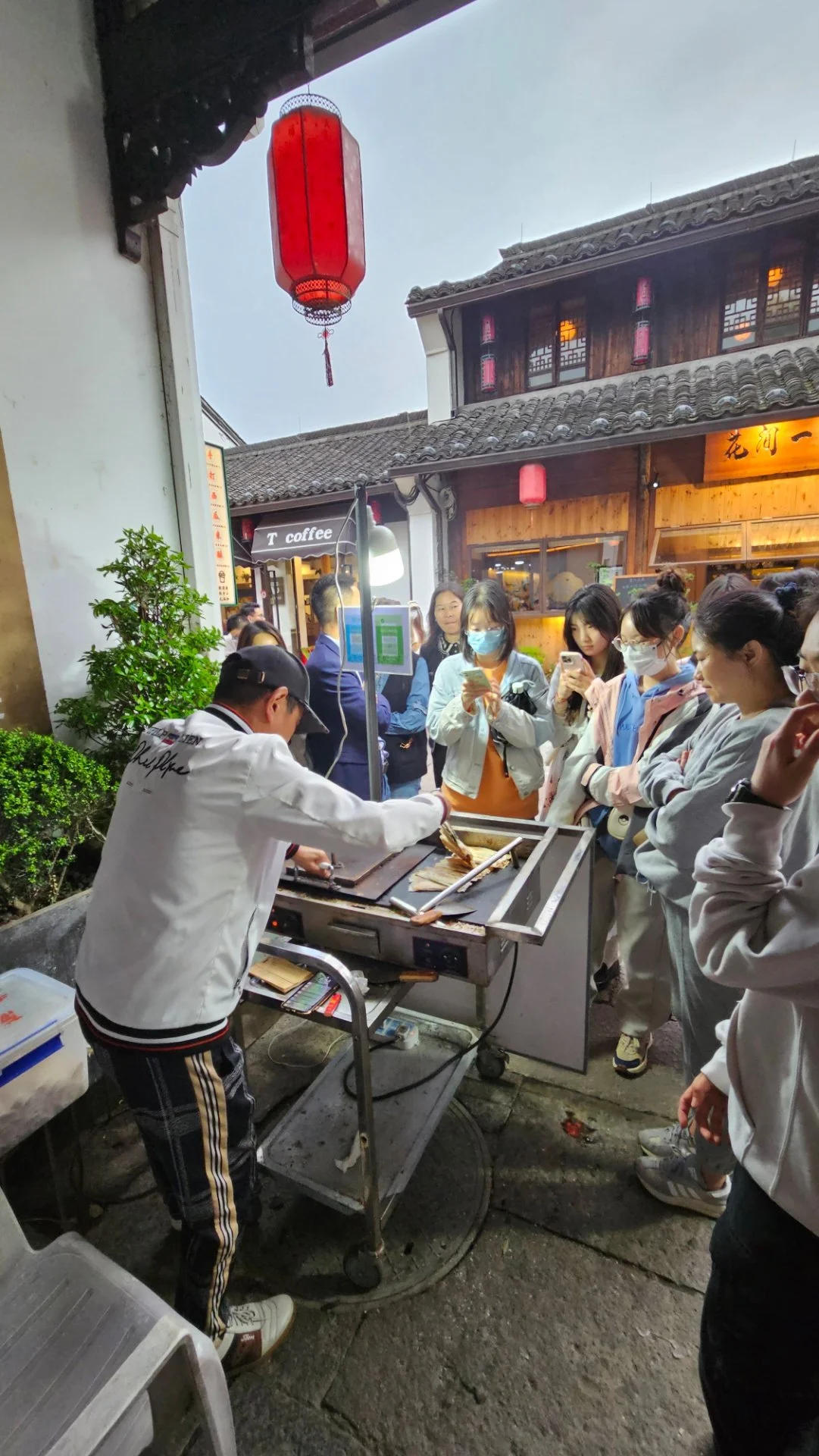 역사문화지구 골목과 운하 건너편 문화광장을 둘러보며 '중국 항저우 비물질문화유산'이라는 글귀가 적힌 종이에 싸서 건네주는 '총바오후얼(葱包桧儿)', 어묵 등 이것저것 주전부리로 저녁을 대신했다.