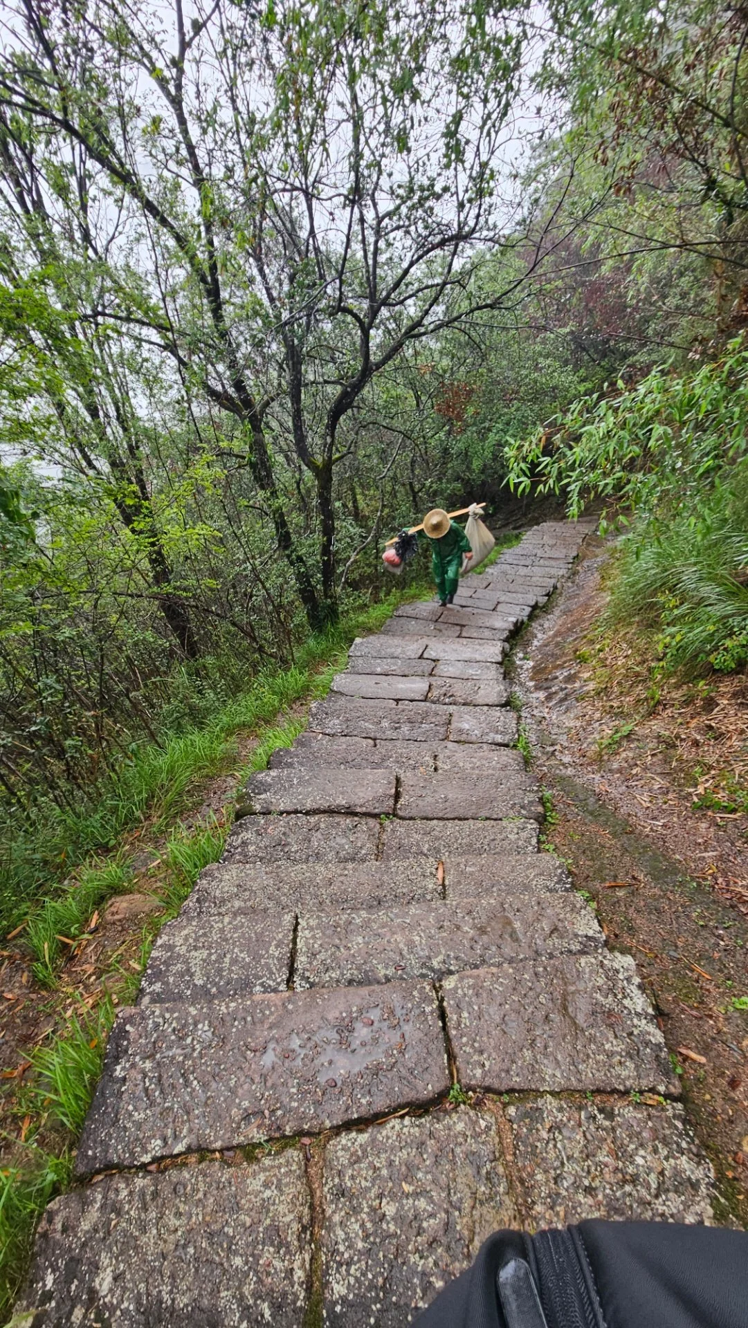 중정공원 패루를 지나고 내리막 계단길이 이어진다. 천유봉 봉우리에 가려 있다가 다시 모습을 드러내는 구곡계 건너편 여러 암봉들은 여전히 운무를 온몸에 걸치고 있다. 공원 관리인으로 보이는 사람 몇몇이 계단길을 쓸거나 수로를 막고 있는 나뭇잎을 치우고 있다. 나무토막 지게로 물건을 나르는 사람도 한 둘 계단을 스쳐 지난다.