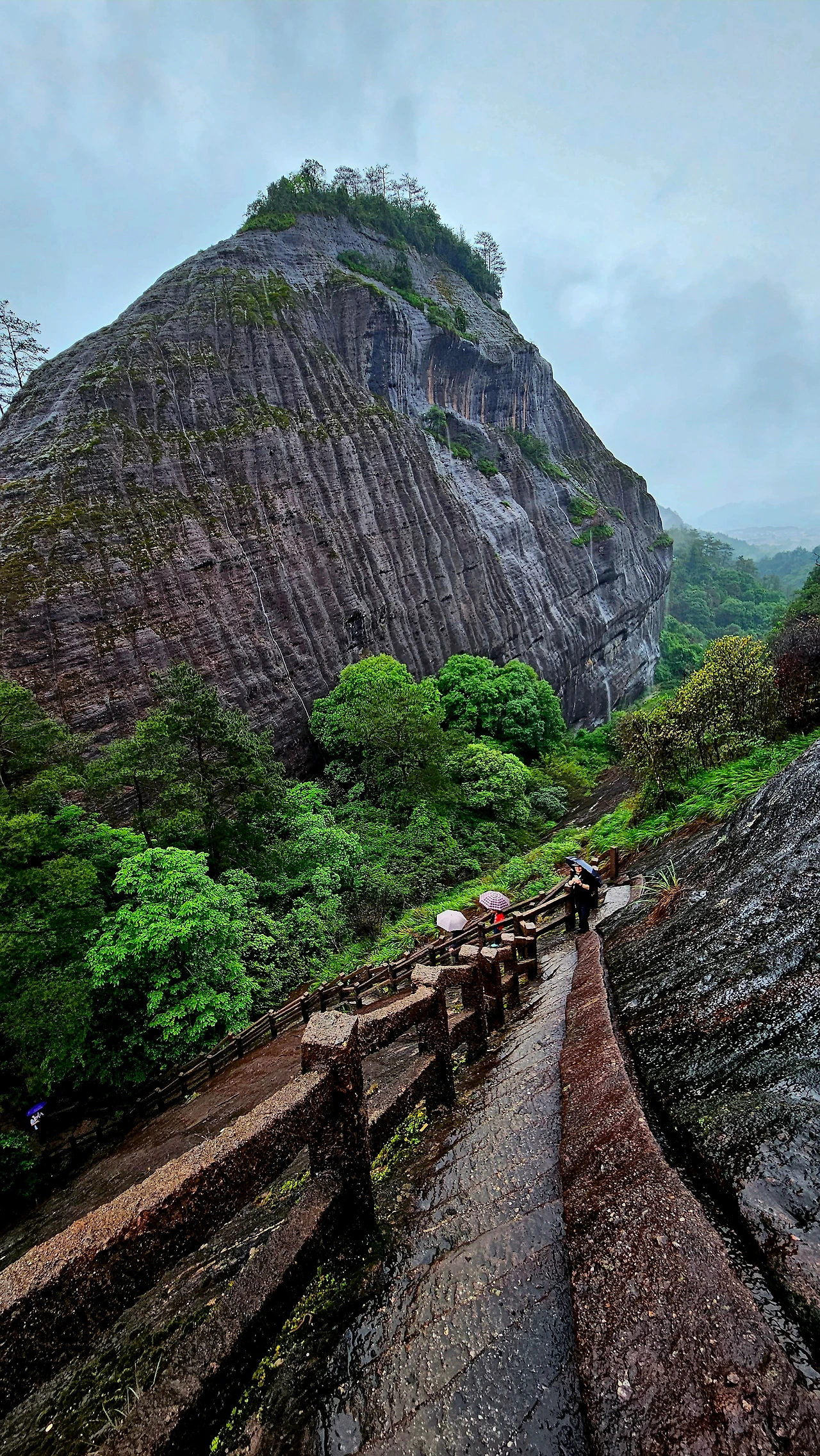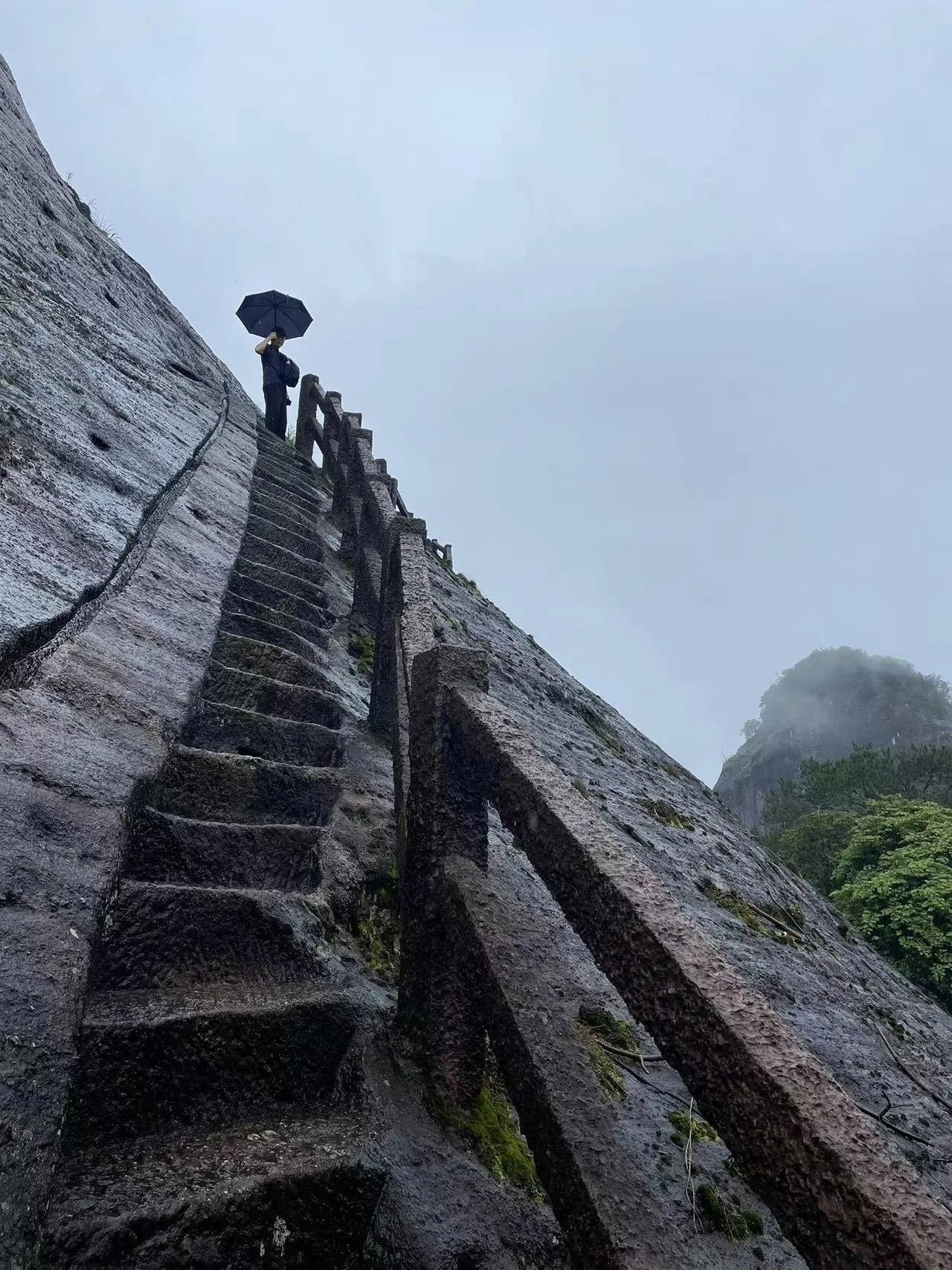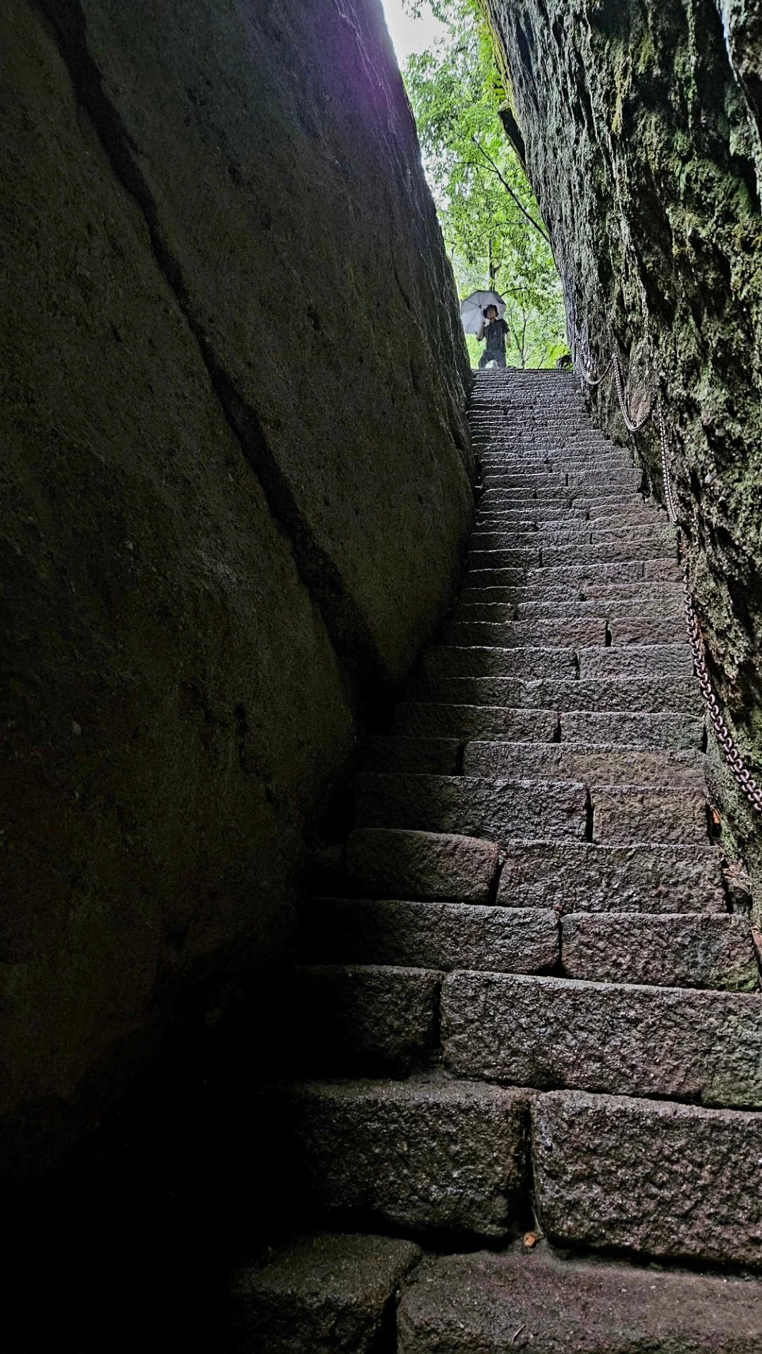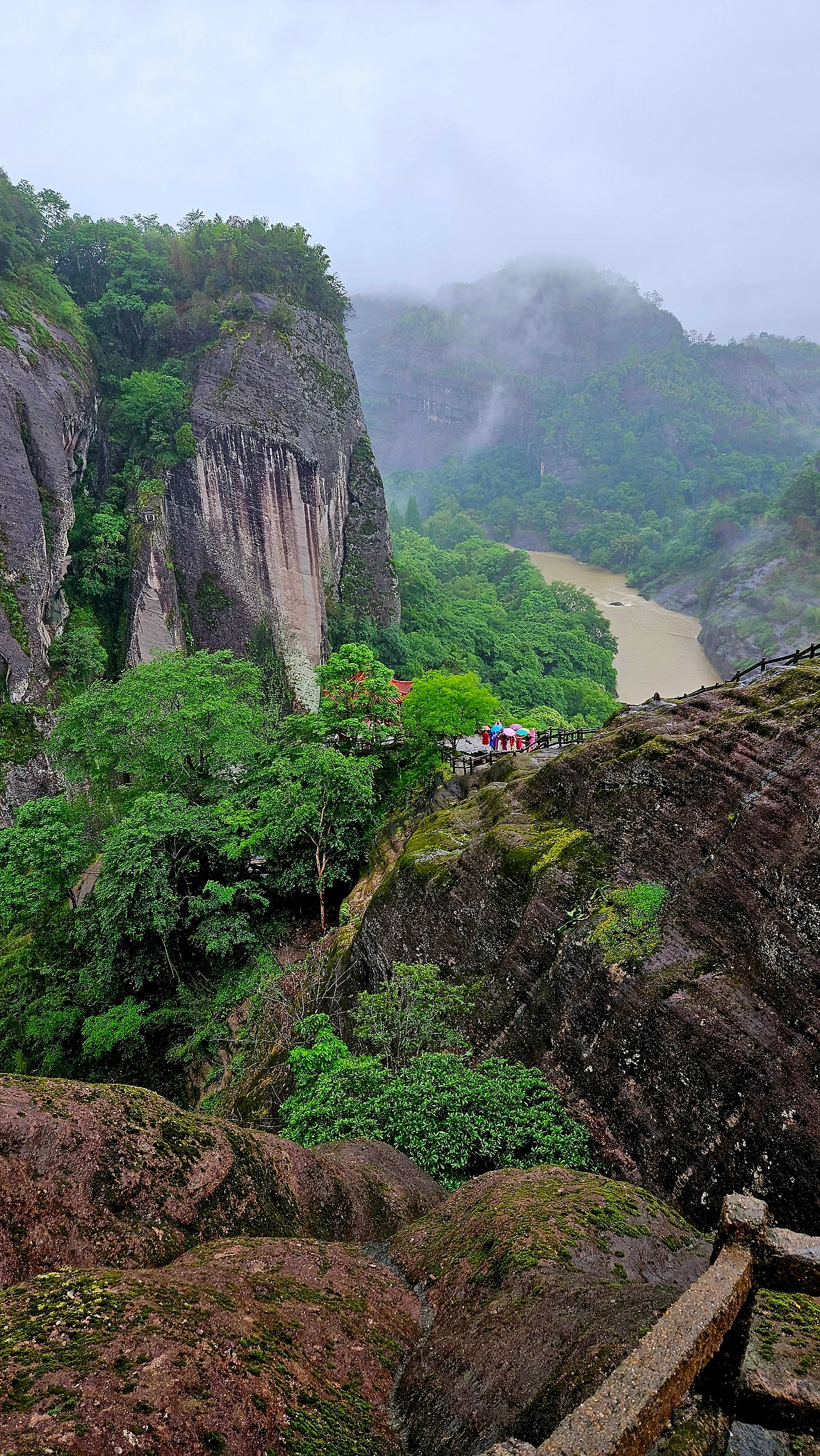 장년의 남녀 한 쌍이 우리 일행과 앞서거니 뒤서거니 하며 절벽으로 난 계단길을 오르며 중간중간 인증 숏을 남기기에 여념이 없다. '중국청년(中国青年)'이라는 로고가 적힌 노란색 티셔츠를 입은 남성은 힘든 기색이 없어 보인다. "중국 청년, 멋있습니다."라고 엄지를 추켜세워 주니 올해 60세로 부부가 함께 허베이성 스지아좡(石家庄)에서 유람을 왔다고 한다. 오늘은 비가 많이 내려서 우이산 유람의 명물인 죽벌(竹筏; 주파) 래프팅을 할 수 없다는 그 부부의 귀띔에 실망이 적지 않다.
