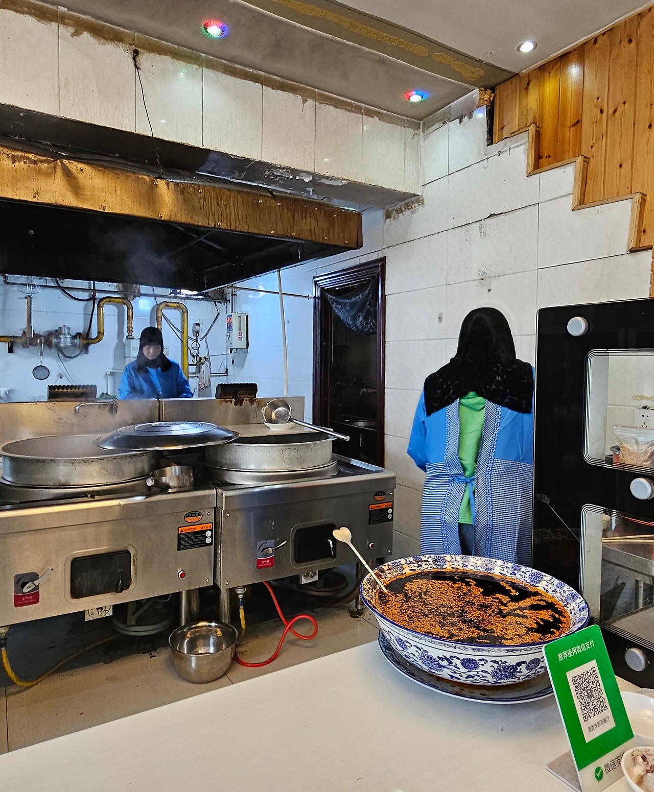 좁고 길게 뻗은 상가 거리 초입에 자리한 회족 식당에 들러 뉘러우면(牛肉面)을 한 그릇씩 시켜서 맛을 음미하며 허기를 채웠다. 이런저런 얘기를 주고받던 식당 여인네들에게 부탁하여 푸른색 상의에 검은색 스카프로 머리를 가린 그녀들과 인증숏을 한 장 남기고 타얼쓰로 걸음을 옮겼다.