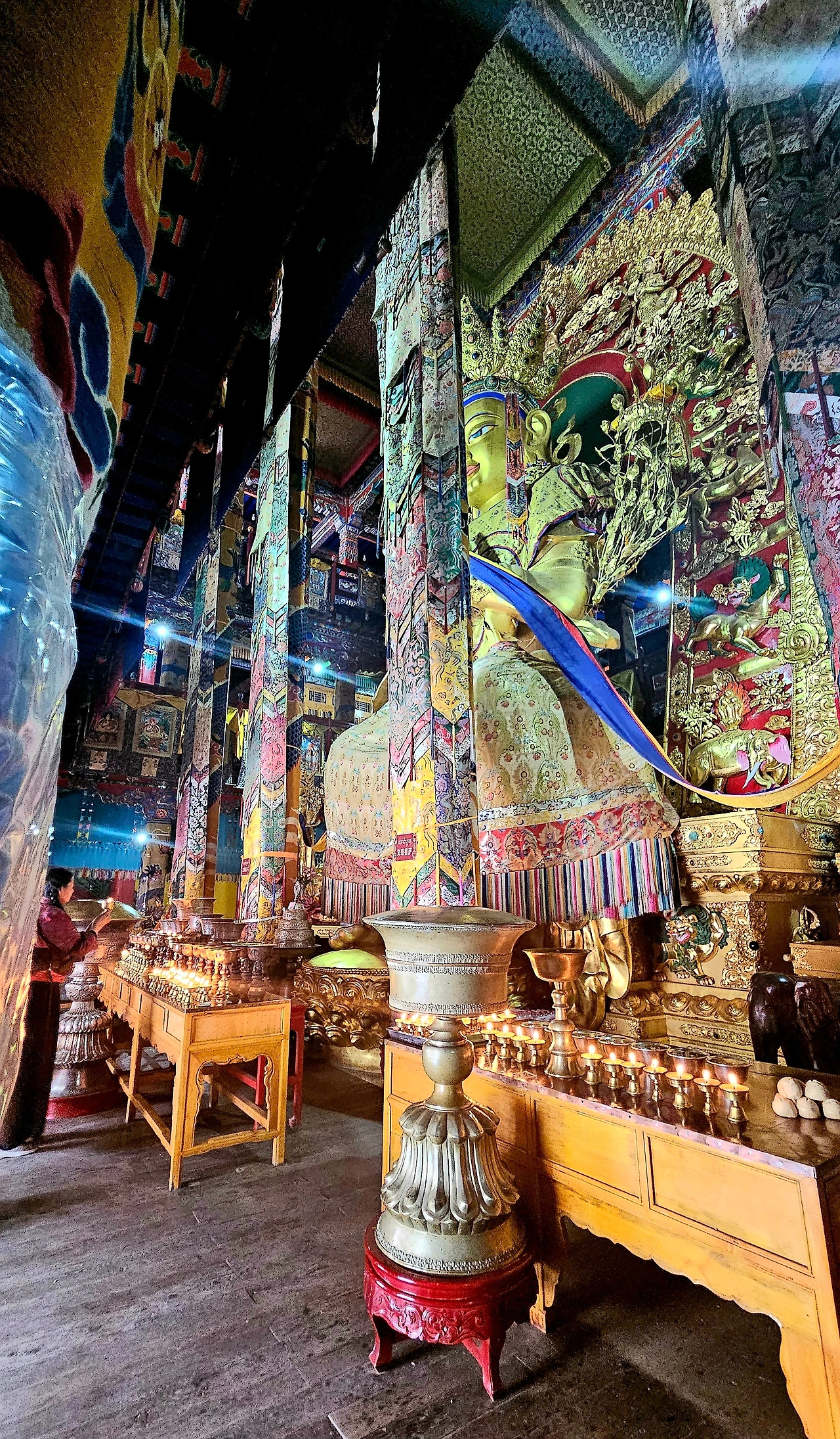 경당 안은 본 사찰의 주지, 달라이 라마 및 판첸 라마의 법좌, 천수천안관음, 미륵보살, 10대 판첸 라마와 총카파 스님 등의 동상과 수 천 개의 불상, 경전, 탕카, 벽화 등으로 채워져 있다.