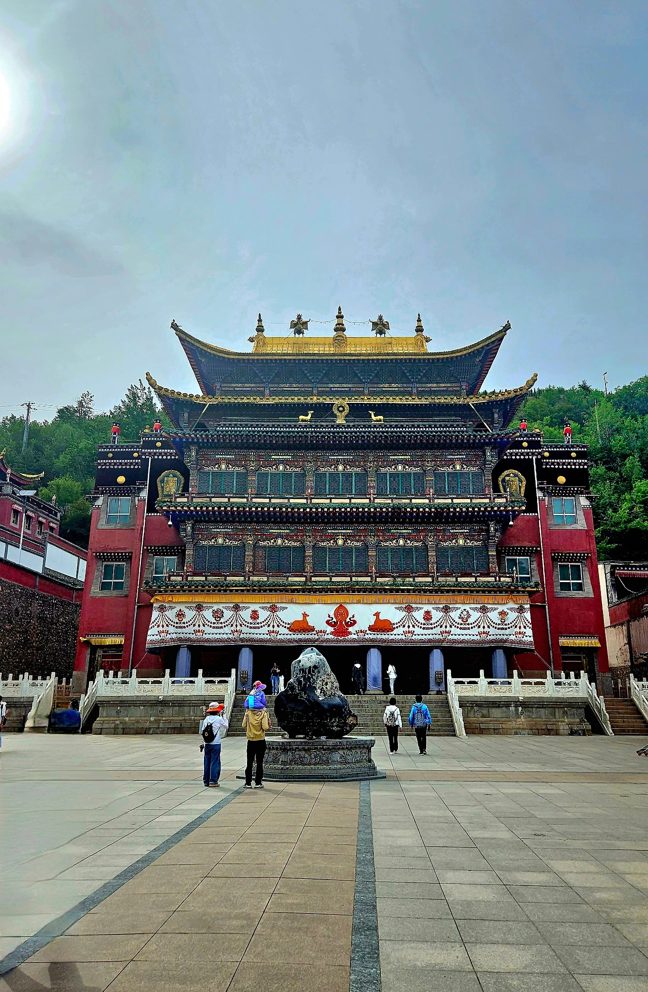 동서중(东西中) 세 산문, 여래팔탑(如来八塔), 호법전(护法殿), 대경당(大经堂), 기도전(折寿殿), 대다방(大茶房), 석가불전(释迦佛殿), 문수보살전(文殊菩萨殿), 미륵불전(弥勒佛殿), 의고전(依怙殿), 시룬경원(时轮经院), 밀종경원(密宗经院), 길상신궁(吉祥新宮), 시룬탑(时轮塔), 장의원(藏医院), 수유화관(酥油花馆), 도모전(度母殿), 인경원(印经院), 보리탑(普提塔), 사문탑(四门塔) 등 무수한 건물들이 산록에서 느린 경사의 산기슭을 따라 빼곡히 자리하고 있다.