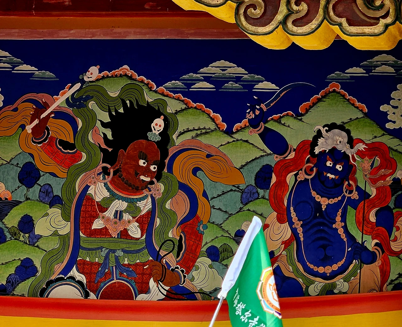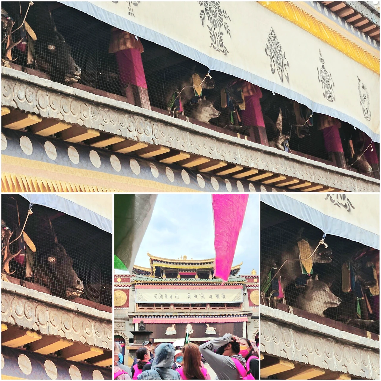중산문(中山門) 정면의 호법신전(護法神殿)은 1692년 건립되고 1802년에 재건되었는데 티베트와 중국의 복합 건축 양식이 반영된 건물이라고 한다. 그 안으로 들어서니 좌우 전각 2층 회랑에 들소, 영양, 원숭이, 오랑우탄, 호랑이, 표범, 흑곰 등의 동물 표본이 아래쪽 마당을 내려다보고 있다. 그 어디에서도 보지 못한 생경한 모습에 의아한 생각이 들었는데, 불교가 정착하기 전 여러 토속 종교를 대표하던 동물들이라고도 하고 불법을 수호하는 위엄을 상징하는 것이라고도 한다. 한편, 마당을 둘러선 전각 벽면에도 기괴한 동물과 인물상 등 화려한 채색 불화가 지금껏 보았던 사찰과는 다른 독특함을 지니고 있어 깊은 인상을 준다.