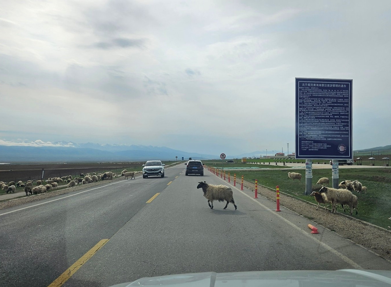 칭하이호가 가까워지자 도로 좌우 산맥이 낮아지며 지평선으로 수렴한다. 칭하이호는 칭하이성 동부에 있는 면적 4,340㎢, 최대 수심 27m의 중국 최대의 염호(鹽湖)로 어업과 소금이 생산되고 그 부근에는 목축업이 활발하다고 한다.