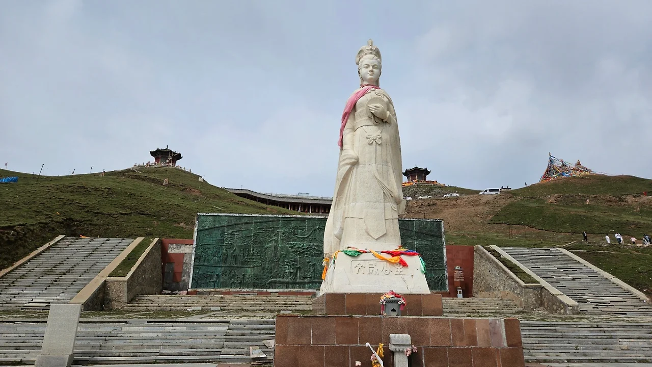 동쪽 고향을 향해 서있는 9미터 높이 옥으로 조각된 문성공주 동상은 가슴에 보경(宝镜)을 꼭 안고 있는데, 그녀는 서쪽으로 돌아서며 보경을 버리고 미지의 토번에서의 삶의 각오를 다졌다고 한다.