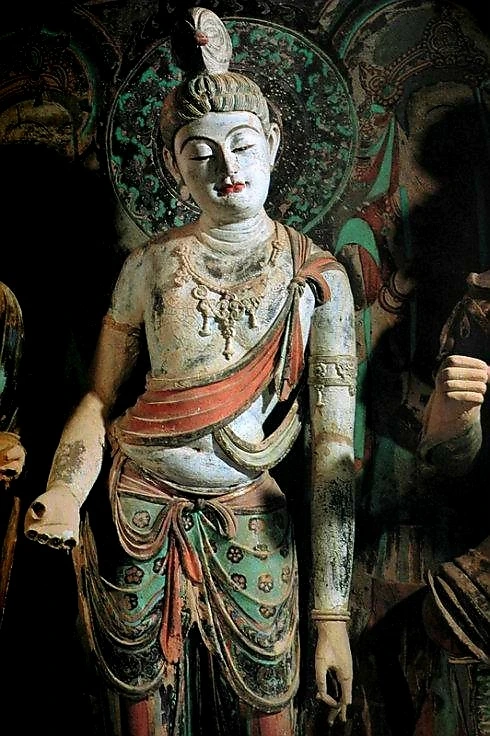 428 굴은 여행자센터 영상실에서 소개되었던 석굴로 암벽 3층 높이에 있어 계단을 올라 입구로 들어섰다. '색채의 연금술사'로 불리는 야수파 조르주 루오(1871-1958)의 그림을 연상케 하는 암갈색 굵고 투박한 터치의 보살상과 석가모니 전생의 투신 보시도 등이 인상적이다.