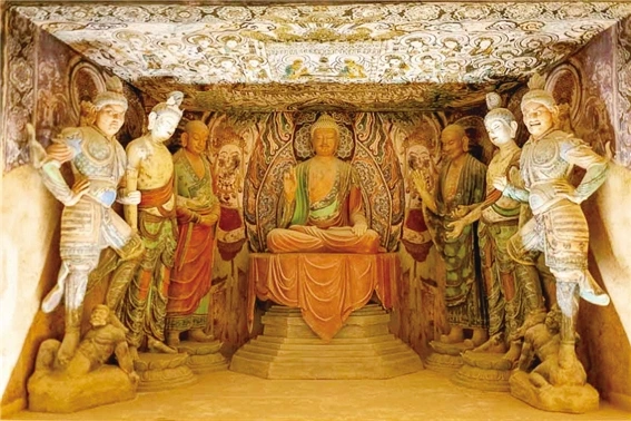 45 굴은 8세기 당나라 때 조성된 석굴로 부처상을 중심으로 천왕상, 보살상, 아난, 가섭 등 좌우에 6위의 조상이 시립해 있는 가장 완벽한 석굴이라 평가된다.