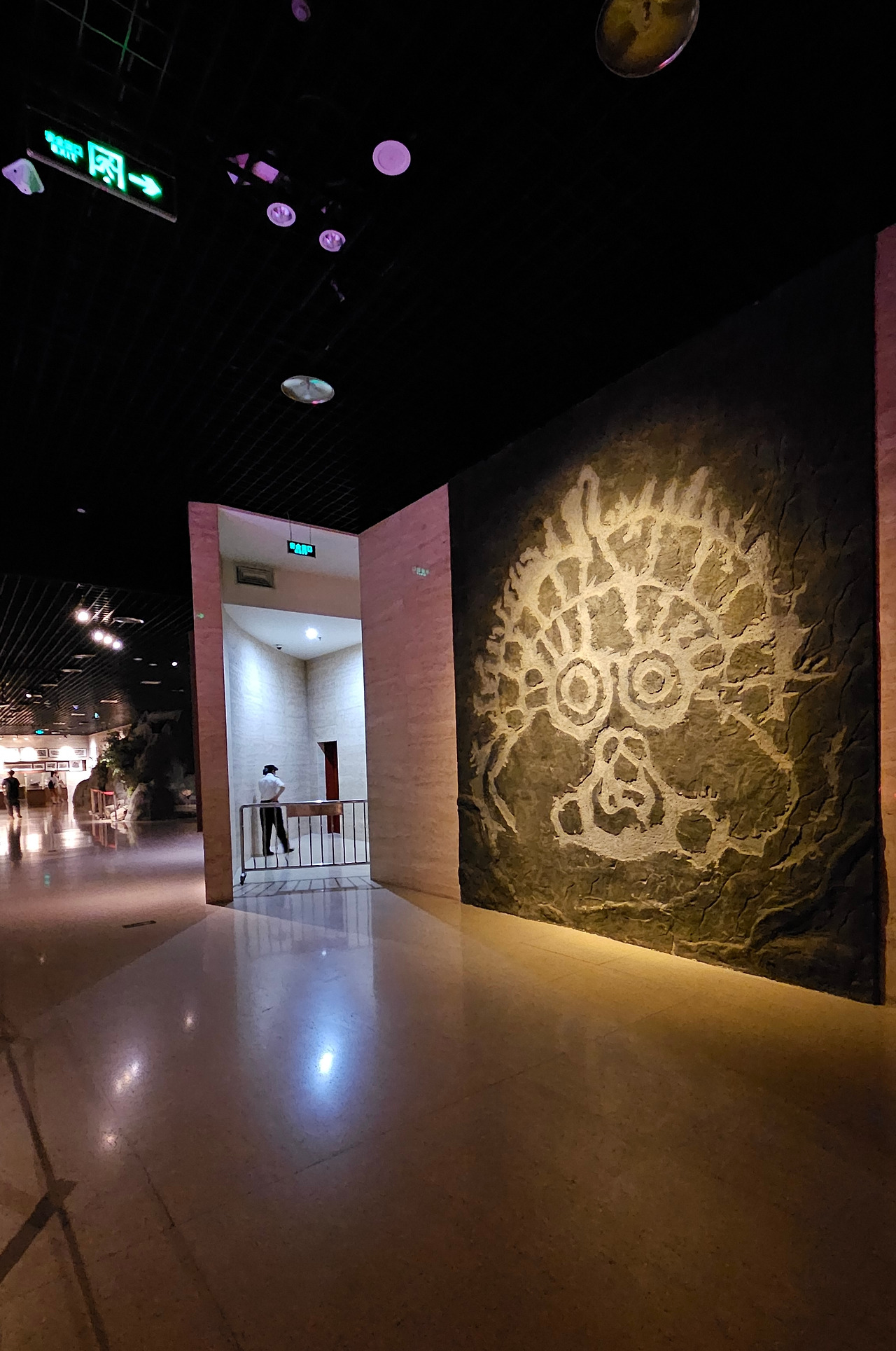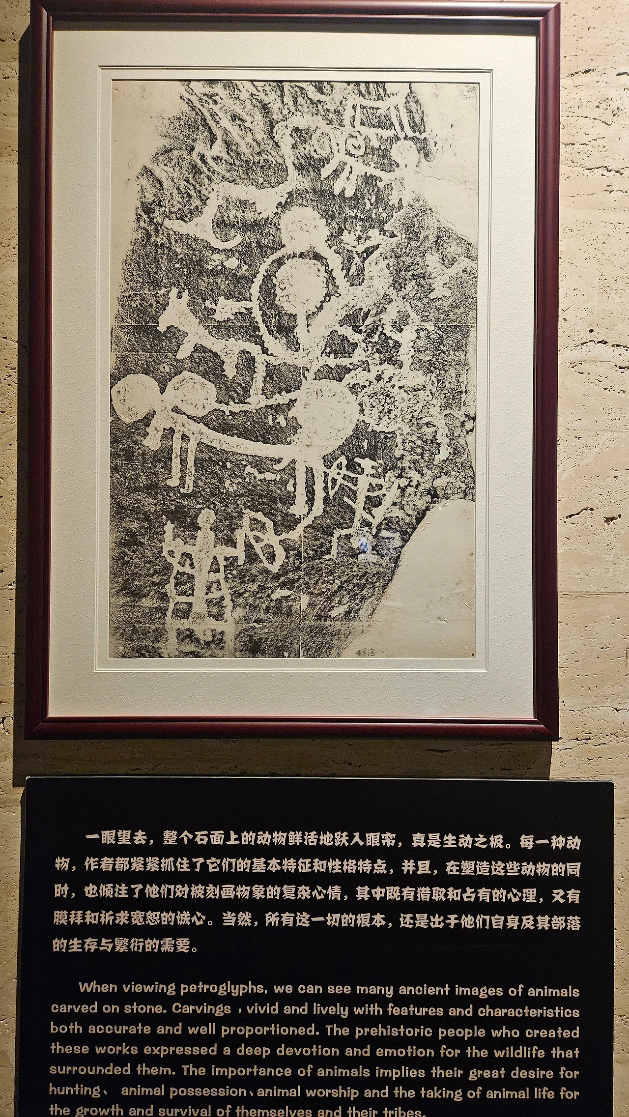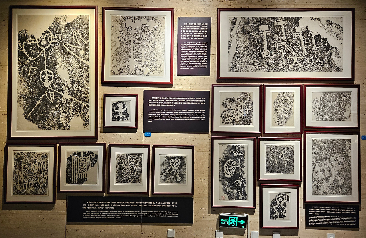 박물관 안으로 들어서니 투명한 원형 유리창으로 장식된 높은 천장의 대형 중앙홀이 맞이한다. 1층에 자리하는 '닝샤 암각화 전시관(石刻史书)'에는 이 지역에서 출토된 방대한 수의 각종 문양의 암각화와 탁본들이 전시되고 있다.